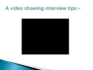 An interview is a conversation where an interviewer asks a candidate questions to evaluate them for a job or gather information. There are different types of interviews like face-to-face, behavioral, telephone. To prepare, candidates should research the company, prepare answers to common questions, and decide what to wear. On the day of the interview, candidates should arrive early, greet the interviewer positively, make eye contact, speak clearly, and thank the interviewer before leaving. Common interview questions assess why the candidate wants the job and is qualified for it.