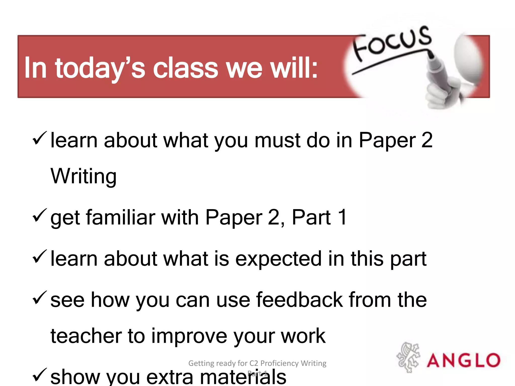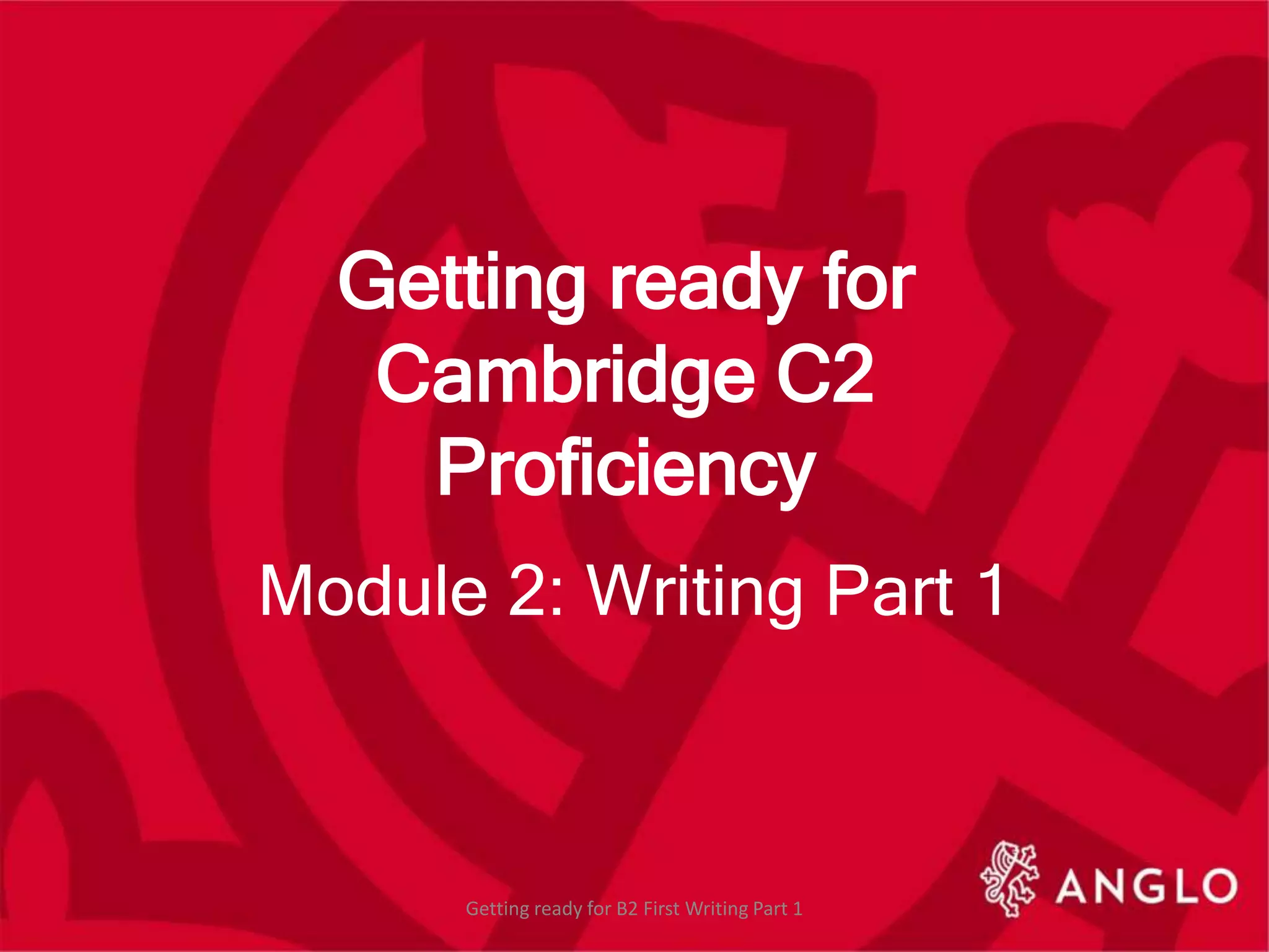 This document provides information about preparing for the Writing Part 1 section of the Cambridge C2 Proficiency exam. It will discuss what is required in Paper 2 Writing Part 1, how to familiarize yourself with the tasks, and how to use feedback to improve. Sample questions are also provided about the length, number of tasks, text types, and word counts required for the Writing Part 1 section.