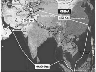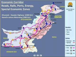 The document summarizes a presentation on the China-Pakistan Economic Corridor (CPEC) project. It discusses the historic background of Gwadar, the introduction and routes of CPEC, development projects under CPEC across various Pakistani provinces, benefits to Pakistan including economic growth and infrastructure development, and foreign interest and conclusion on CPEC being a game changer. The presentation was given by 4 students with areas of interest covering Gwadar, introduction to CPEC, development projects, benefits, and foreign interest.