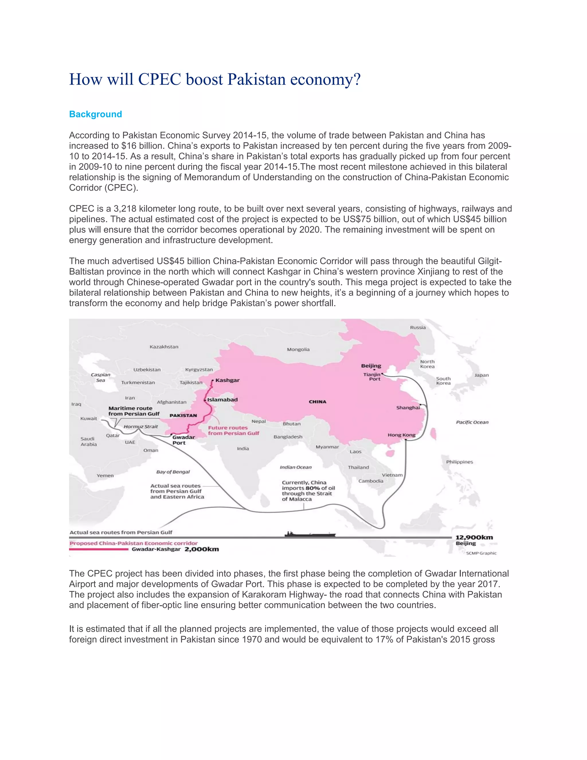 The China-Pakistan Economic Corridor (CPEC) is a $75 billion investment in Pakistan that aims to connect China's western province of Xinjiang to Pakistan's southern port of Gwadar. The 3,218 kilometer corridor will include highways, railways, and pipelines to facilitate trade and energy projects. It is estimated that CPEC will create 700,000 jobs and add 2.5% to Pakistan's annual GDP growth. While CPEC promises immense economic opportunities by reducing trade costs, some have concerns over local displacement, lack of transparency, and uneven provincial investment allocations. The project's finalized route aims to minimize costs and pass through six Pakistani provinces.