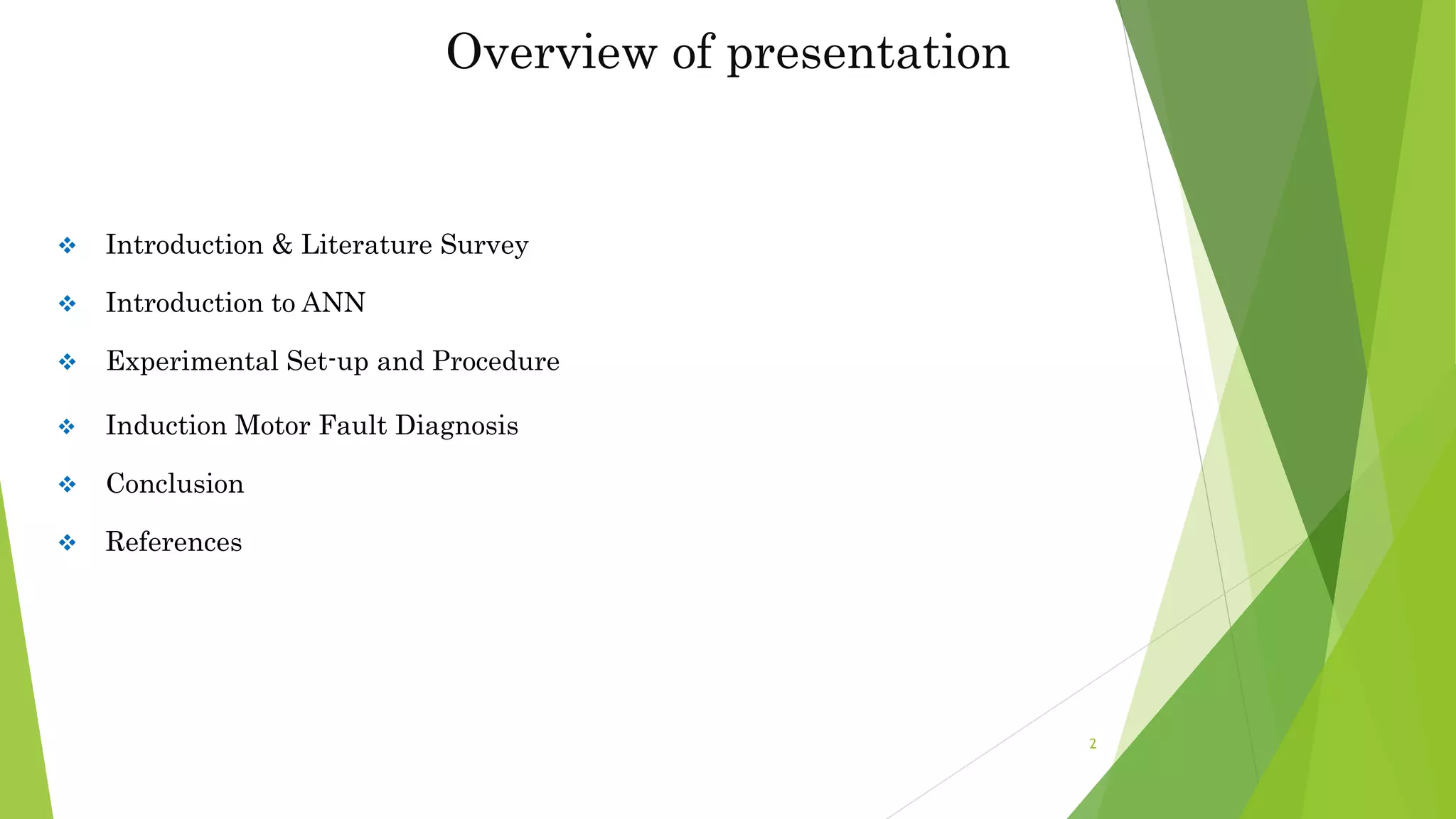 This document summarizes a presentation on using artificial neural networks for fault diagnosis of induction motors. It includes an overview of induction motor faults, both electrical and mechanical. An experimental setup is described that uses a machinery fault simulator to introduce various seeded faults to a test motor. Data on vibration and motor current is collected across different motor speeds and fault conditions. An artificial neural network model is trained on 80% of the data and tested on the remaining 20% for fault diagnosis. The model achieves over 88% accuracy in diagnosing faults even when testing data comes from an intermediate speed not in the training data. The conclusions state that the ANN approach can successfully diagnose both mechanical and electrical induction motor faults.