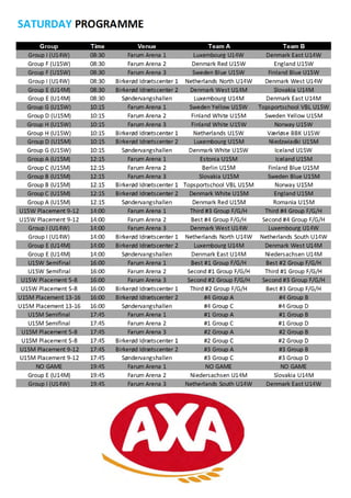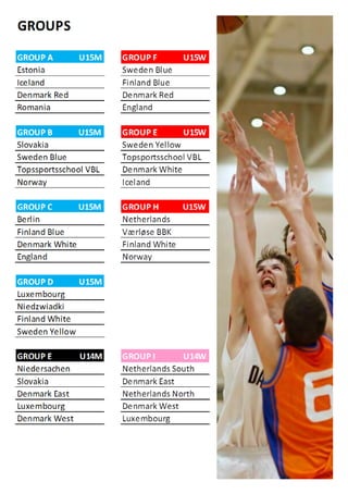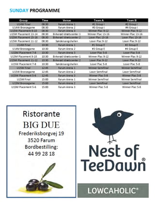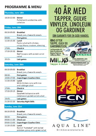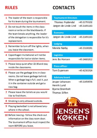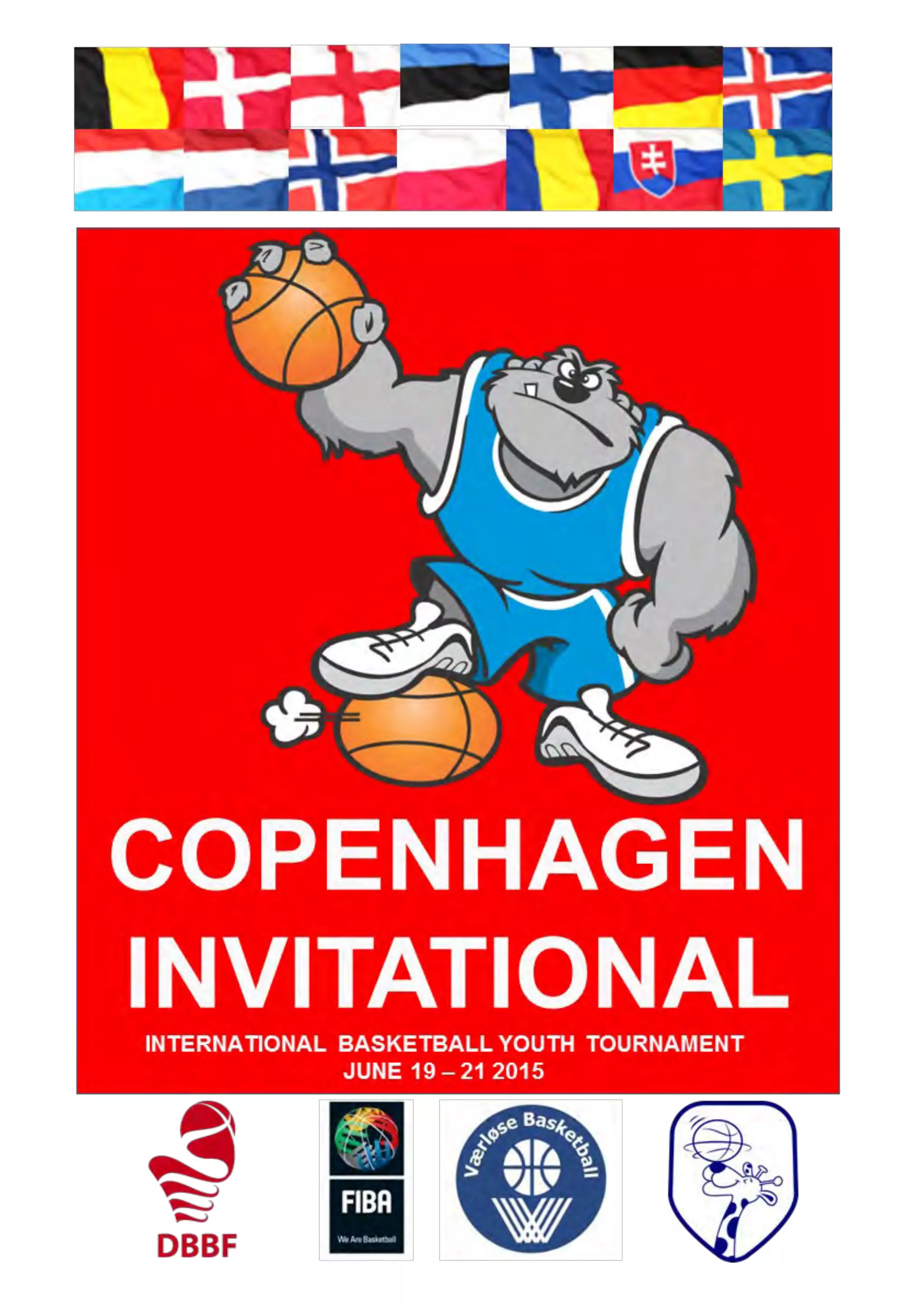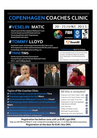 This document contains welcoming messages and announcements for the Copenhagen Invitational Basketball Tournament being held in Denmark. It includes greetings from the president of the hosting basketball club, the mayors of the two local municipalities providing facilities, and announcements about food for sale at the event and a sponsor of the tournament. The tournament is attracting over 600 youth participants from 13 countries and is praised for highlighting basketball at an international level and inspiring local youth.
