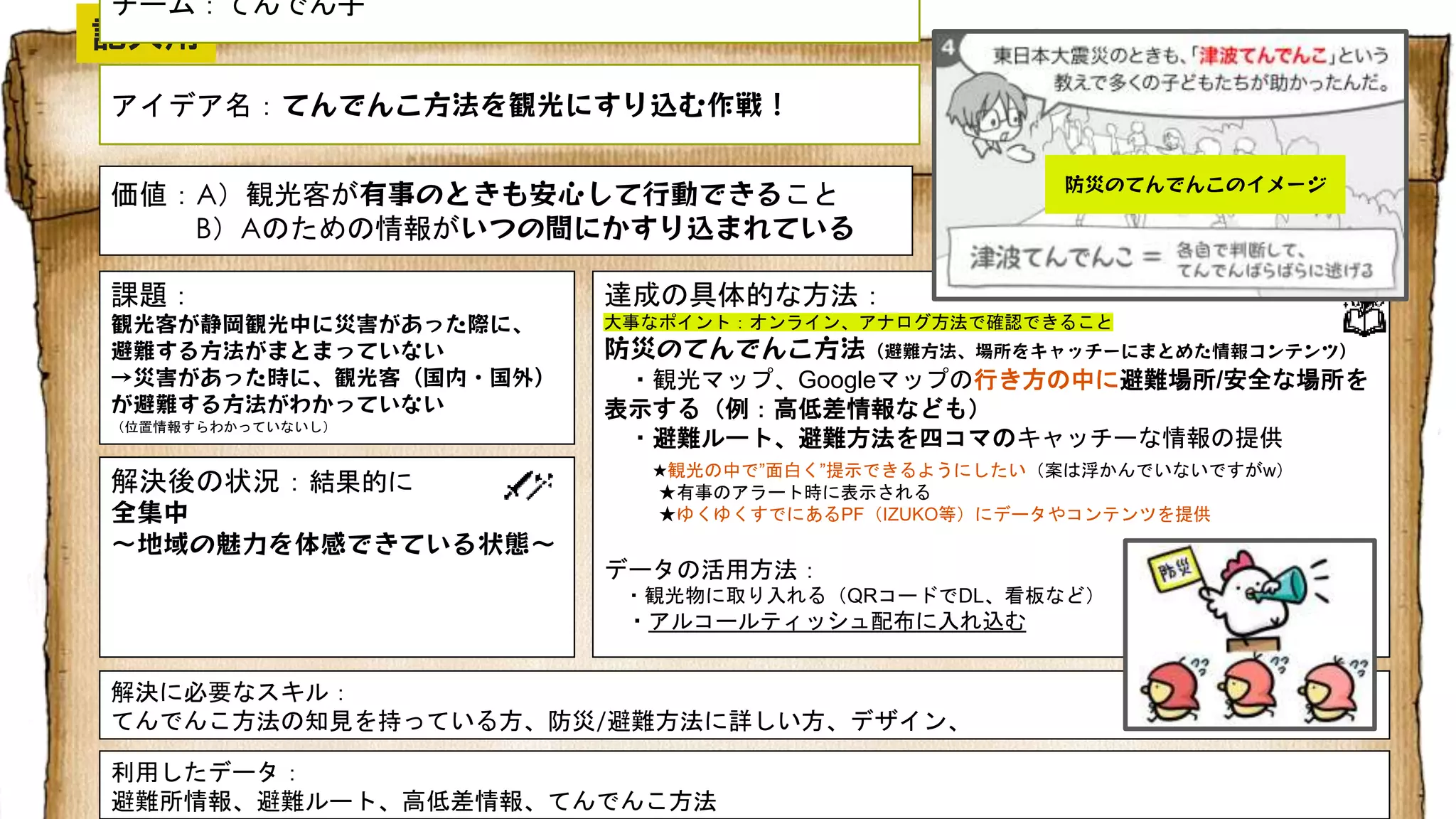 Code for ふじのくに アイデア名:てんでんこ方法を観光にすり込む作戦! 課題: 観光客が静岡観光中に災害があった際に、 避難する方法がまとまっていない →災害があった時に、観光客(国内・国外) が避難する方法がわかっていない (位置情報すらわかっていないし) 解決後の状況:結果的に 全集中 ~地域の魅力を体感できている状態~ 達成の具体的な方法: 大事なポイント:オンライン、アナログ方法で確認できること 防災のてんでんこ方法(避難方法、場所をキャッチーにまとめた情報コンテンツ) ・観光マップ、Googleマップの行き方の中に避難場所/安全な場所を 表示する(例:高低差情報なども) ・避難ルート、避難方法を四コマのキャッチーな情報の提供 ★観光の中で”面白く”提示できるようにしたい(案は浮かんでいないですがw) ★有事のアラート時に表示される ★ゆくゆくすでにあるPF(IZUKO等)にデータやコンテンツを提供 データの活用方法: ・観光物に取り入れる(QRコードでDL、看板など) ・アルコールティッシュ配布に入れ込む 解決に必要なスキル: てんでんこ方法の知見を持っている方、防災/避難方法に詳しい方、デザイン、 利用したデータ: 避難所情報、避難ルート、高低差情報、てんでんこ方法 価値:A)観光客が有事のときも安心して行動できること B)Aのための情報がいつの間にかすり込まれている 記入用 チーム:てんでん子 防災のてんでんこのイメージ