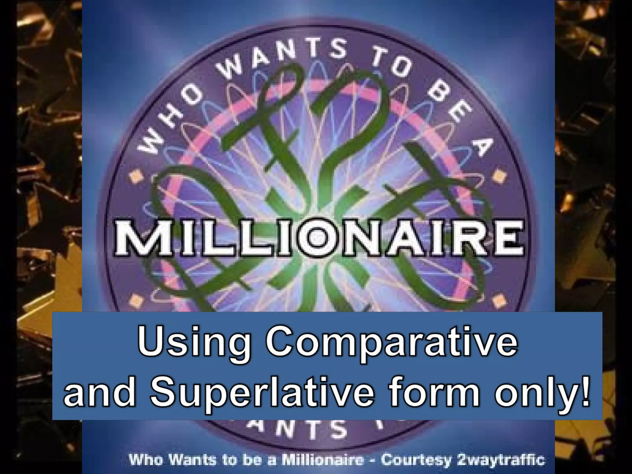 The document is a quiz that tests knowledge of comparative and superlative forms of adjectives. It contains multiple choice questions with the correct answers being: bigger, largest, more beautiful, most powerful, better, handsomer, sweeter, most positive, cleverer, biggest, farther.