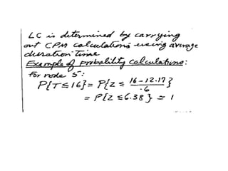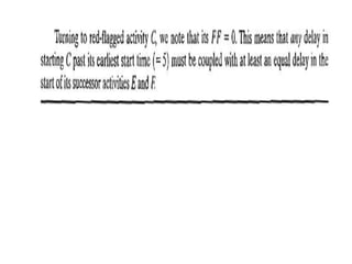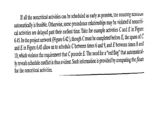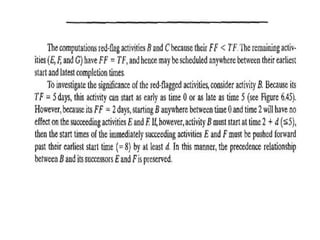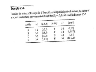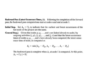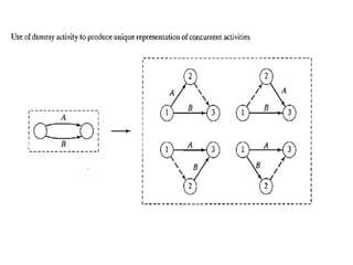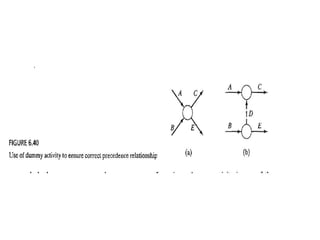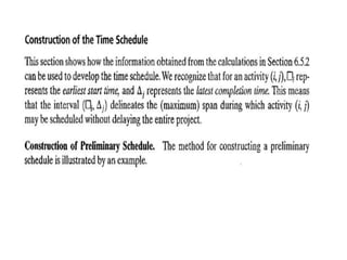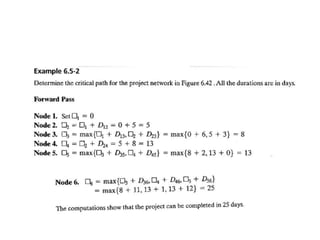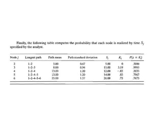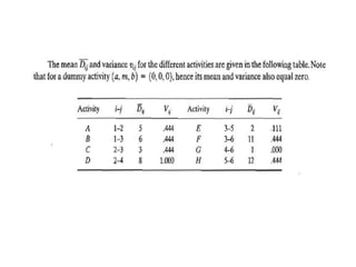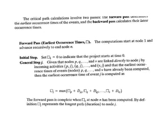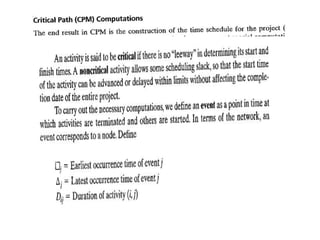The document discusses the Critical Path Method (CPM) and Program Evaluation and Review Technique (PERT) for project scheduling. CPM determines the minimum project duration when activity times are known with certainty, while PERT estimates the probability of completing on time when activity times are uncertain. Both methods represent projects as networks and identify critical paths that must be followed to complete on schedule.