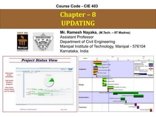 This document discusses the process of updating a project network diagram based on actual project progress and changes. It provides definitions and explanations of updating, describes the data and steps required for the updating process, and gives an illustrative example of updating the network for a project after 12 days where some activities finished earlier than planned while others were delayed. The example network is updated by assigning completion times, remaining durations and revised estimates based on new information, and recalculating the critical path.