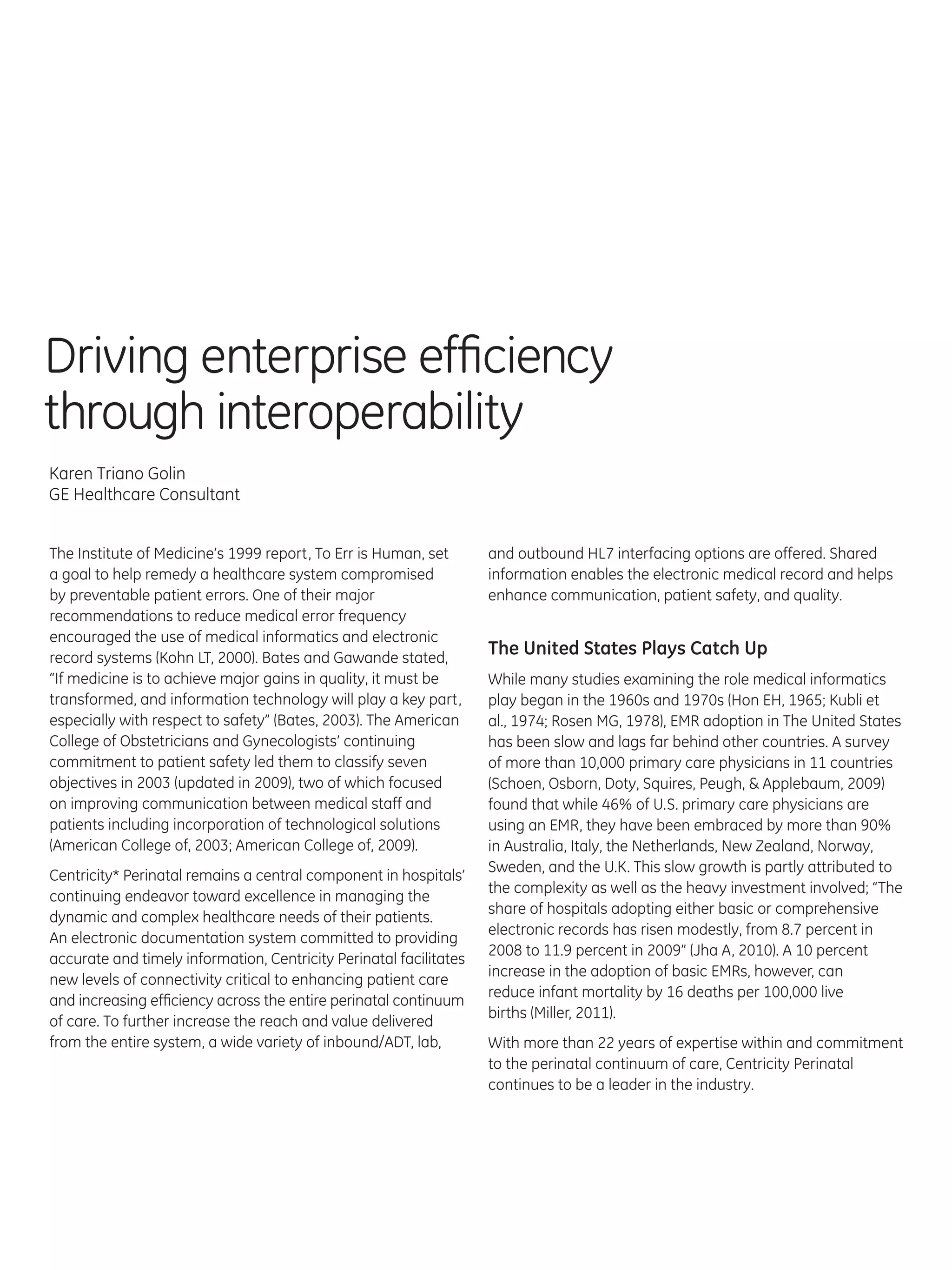 This document discusses the benefits of implementing an electronic medical records (EMR) system for perinatal care. It notes that EMRs can help reduce medical errors, improve communication and patient safety, and support clinical decision making. The document also outlines how EMRs can help healthcare organizations meet meaningful use criteria, enhance defensive medicine practices, and potentially improve their financial bottom line over time. Overall, the document advocates for EMR adoption in perinatal care due to the clinical benefits and opportunities it provides.
