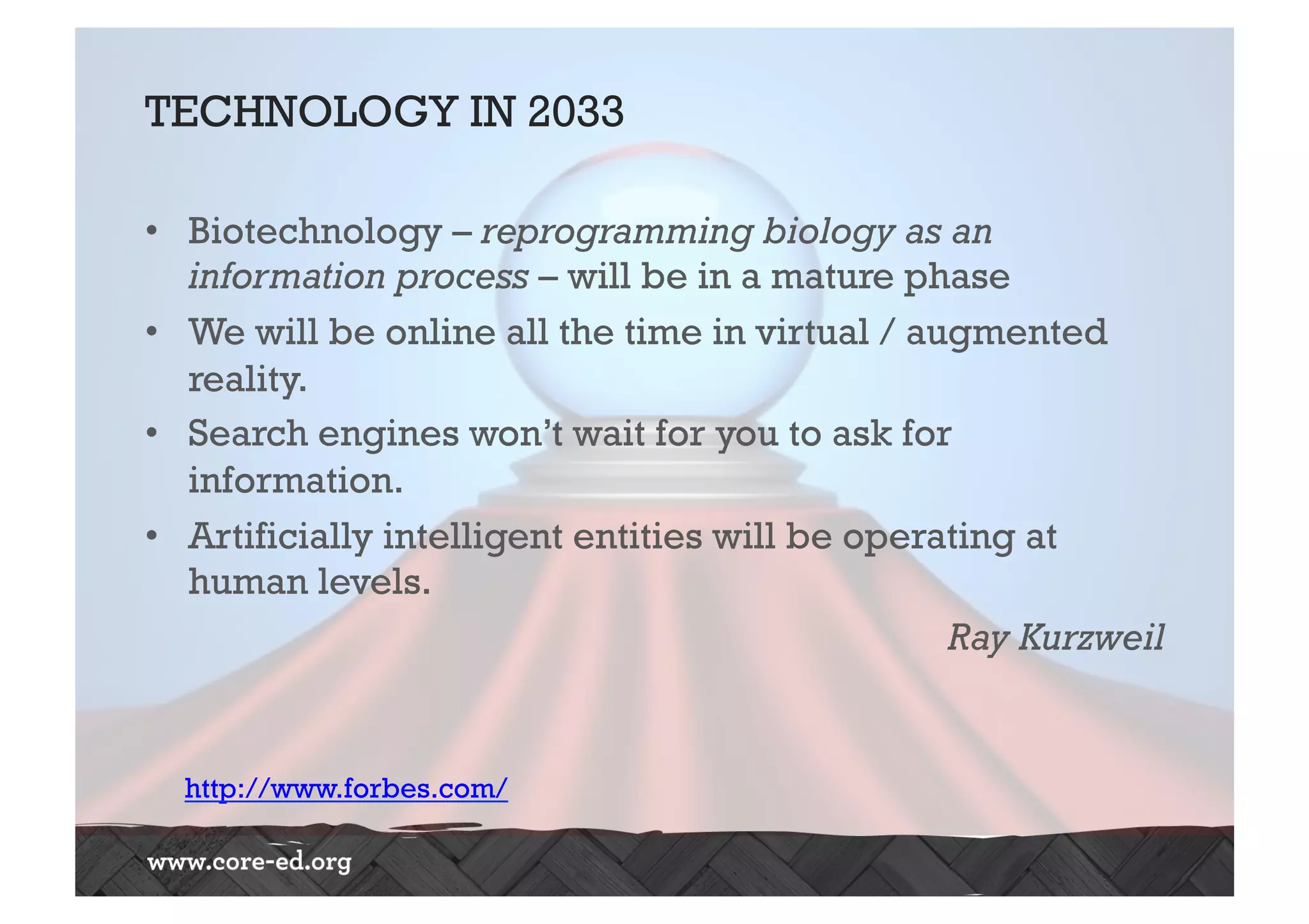 The document discusses predictions for technology, education, and workforce changes by 2033, emphasizing advancements in biotechnology, AI, and an increasingly mobile workforce. It highlights the importance of personalized education, interactive classrooms, and the necessity for teachers to adapt their practices to meet evolving student expectations and technological accessibility. The role of networks in learning and the need for adaptive educational frameworks are also stressed.