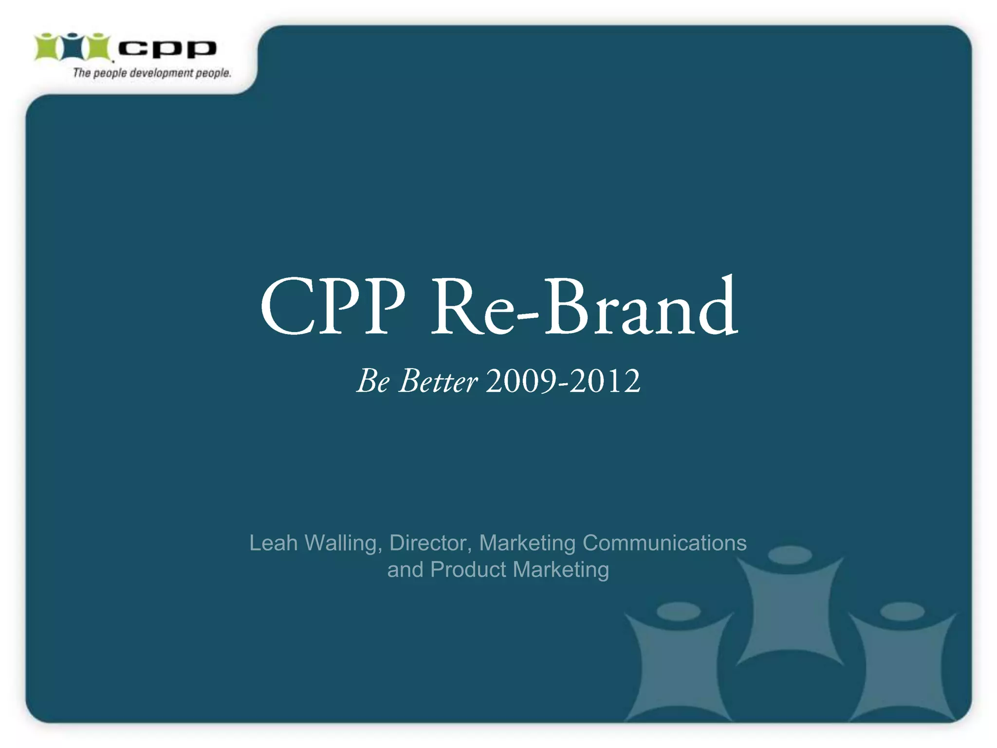 The document appears to be a presentation from Leah Walling, Director of Marketing Communications and Product Marketing at CPP, Inc. It showcases new and refreshed creative assets for CPP's branding, products, and marketing campaigns in 2011, including refreshed front and back covers, advertisements, landing pages, emails, brochures, and website pages. The presentation concludes by providing Leah Walling's contact information and listing trademarks.