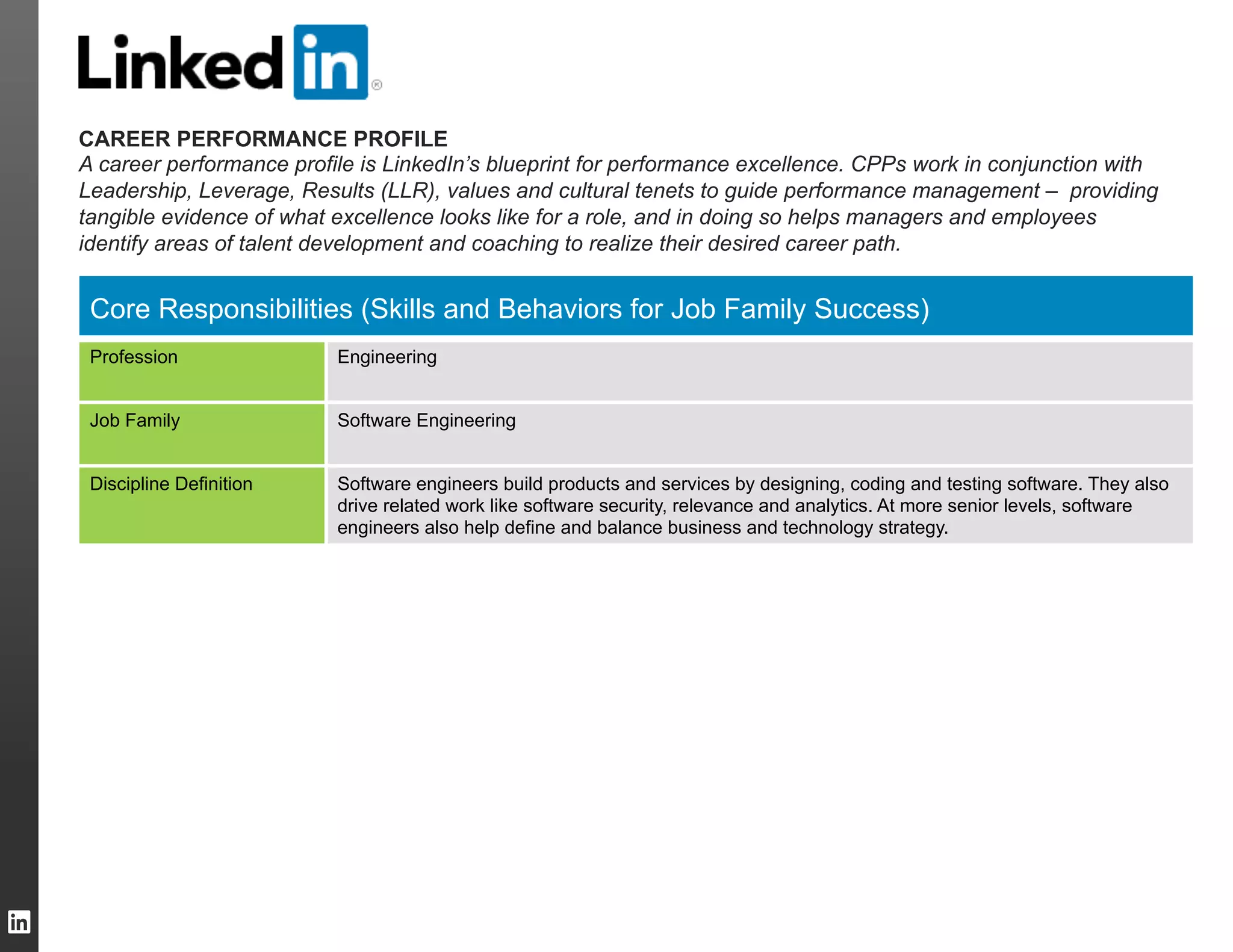 The document provides information on core responsibilities and performance expectations for different levels of software engineering roles at LinkedIn. It outlines expectations around leadership, execution, and technical skills. For leadership, expectations progress from role modeling good behaviors to leading discussions and mentoring others. For execution, responsibilities scale from understanding team goals to collaborating across teams. And technical skills expected increase in complexity from building to requirements to defining technical strategies that impact the organization. The document is intended to help employees and managers identify areas for development and coaching to achieve career goals.