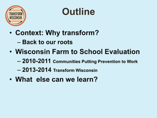 - A Wisconsin Farm to School evaluation assessed the impact of farm to school programming on student outcomes from 2010-2011 and 2013-2014.