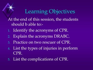 This document provides instructions for performing basic life support cardiopulmonary resuscitation (CPR) with two rescuers. It outlines the learning objectives and describes the steps of CPR using the acronym DRABC: Danger, Responsiveness, Airway, Breathing, and Circulation. The roles of each rescuer are defined for assessing the scene, checking responsiveness, opening the airway, giving rescue breaths, and performing chest compressions in a cycle of compressions and ventilations. Potential injuries from CPR like rib fractures and complications like vomiting are also listed.