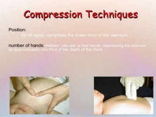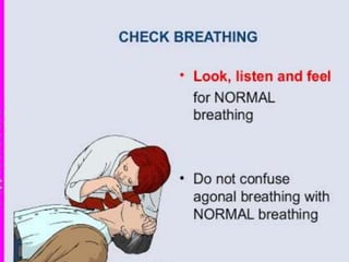 The document discusses cardiopulmonary resuscitation (CPR), including its history, purpose, procedures, and complications. CPR involves restoring heart and lung function through chest compressions and rescue breathing when someone's breathing or heartbeat has stopped. The seminar reviews the anatomy and physiology related to CPR, defines CPR, discusses indications like cardiac arrest, and outlines the proper CPR procedure of assessing the scene, calling for help, providing chest compressions and rescue breaths. Potential complications of CPR are also reviewed.