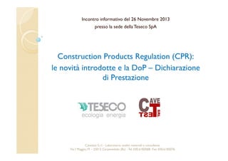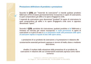 Il documento discute il regolamento (UE) n. 305/2011 (CPR) relativo ai prodotti da costruzione, stabilendo le condizioni per la loro immissione sul mercato e la marcatura CE. Presenta le principali novità del CPR, tra cui l'aggiunta di un settimo requisito per l'uso sostenibile delle risorse naturali e procedure semplificate per la documentazione tecnica. Viene sottolineata l'importanza della sorveglianza del mercato e dell'accreditamento degli organismi di controllo per garantire la sicurezza e la qualità dei materiali da costruzione.