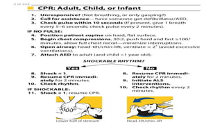 This document discusses cardiopulmonary resuscitation (CPR). It defines CPR as a technique used to establish artificial ventilation and circulation for a patient whose heart has stopped. It notes that CPR may save a victim's life if started within 4 minutes of cardiac arrest and defibrillation is provided within 10 minutes, giving a 40% chance of survival. The document then outlines the basic steps of CPR including checking for response, opening the airway, checking for breathing, and beginning chest compressions at a rate of 100-120 compressions per minute with rescue breaths every 30 compressions. It also discusses advanced CPR techniques used in a hospital setting that include advanced airway management and use of defibrillation and