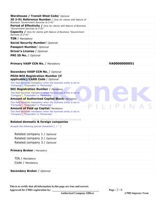 The document outlines the information required to register an importer profile in the Client Profile Registration System (CPRS). It lists various mandatory and optional data items that must be provided, including company details, addresses, contact information, tax identification numbers, principal officers, and major suppliers. The registration involves submitting a completed form along with tax documents by email.