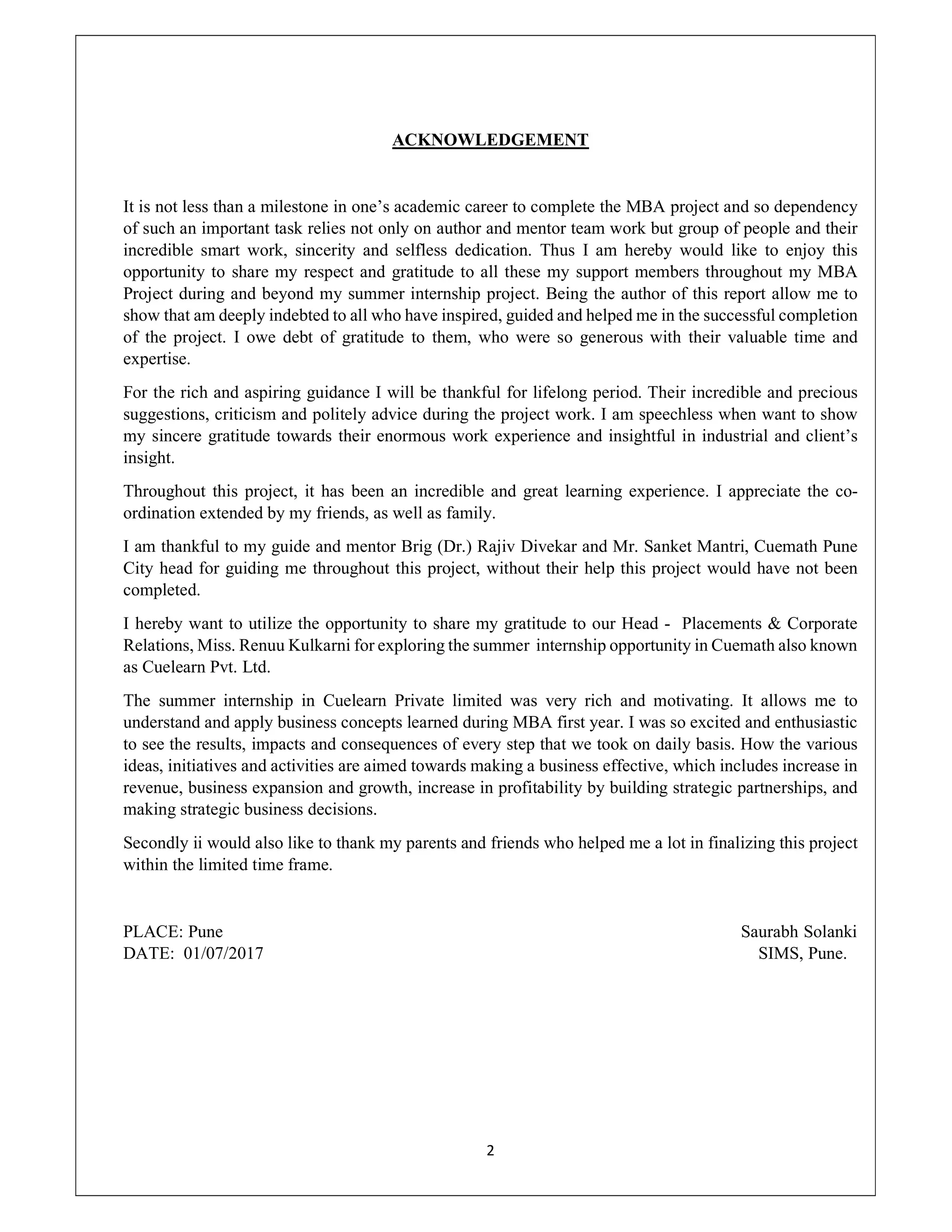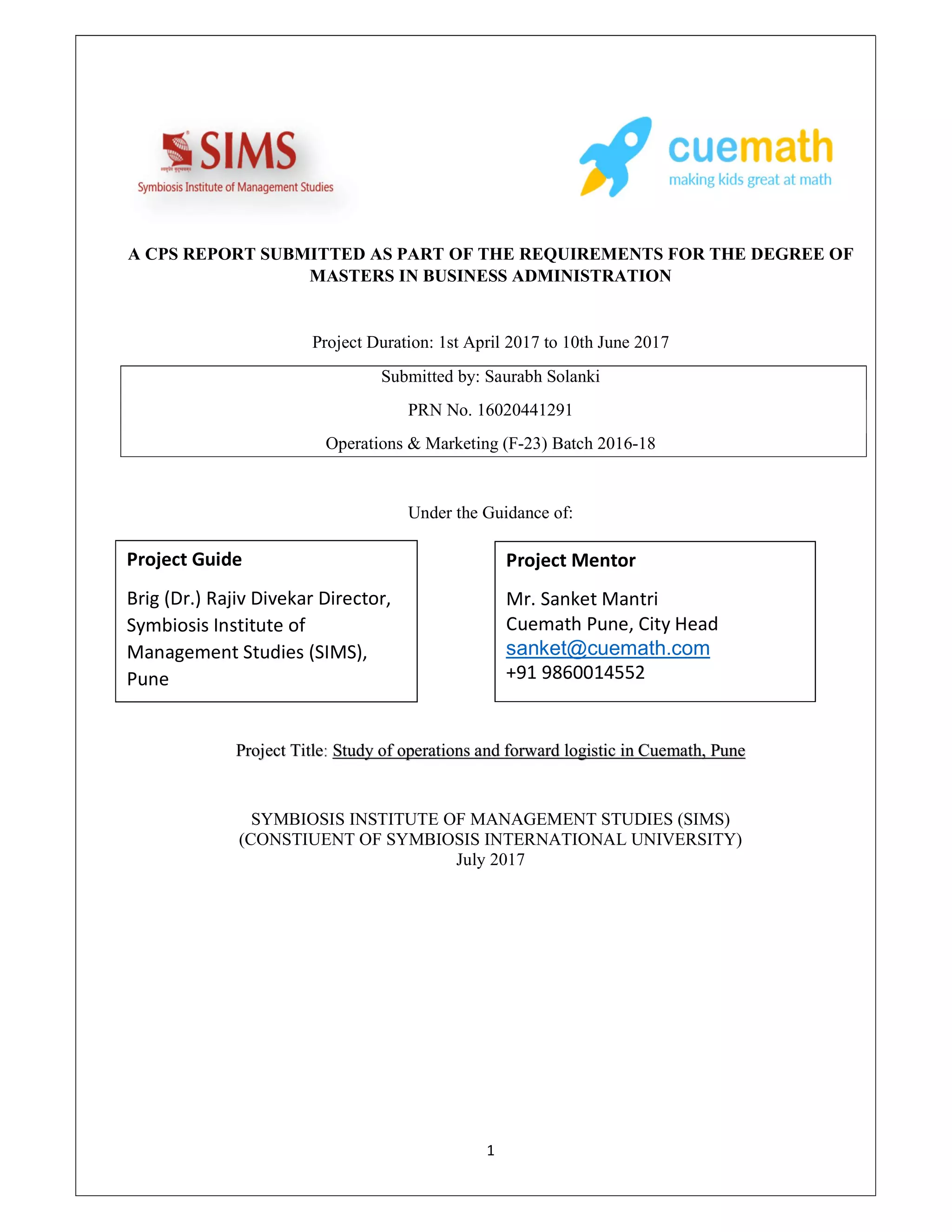 The document is a CPS report submitted by Saurabh Solanki for a master's degree in business administration, focusing on the study of operations and forward logistics at Cuemath in Pune. It highlights the importance of Cuemath in enhancing children's math skills through a structured learning approach while also empowering teachers through a unique business model. The report examines operational activities, logistics, and marketing strategies that support Cuemath's growth and effectiveness in the ed-tech sector.