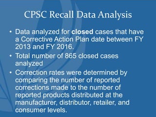 The CPSC analyzed 865 closed recall cases from FY 2013 to FY 2016, revealing an overall correction rate of 65%. Higher correction rates were linked to recall alerts, which effectively notify 95% of affected consumers, compared to lower rates for press releases. The CPSC acknowledges the difficulties in achieving consumer corrections and seeks collaborative efforts to enhance recall effectiveness.