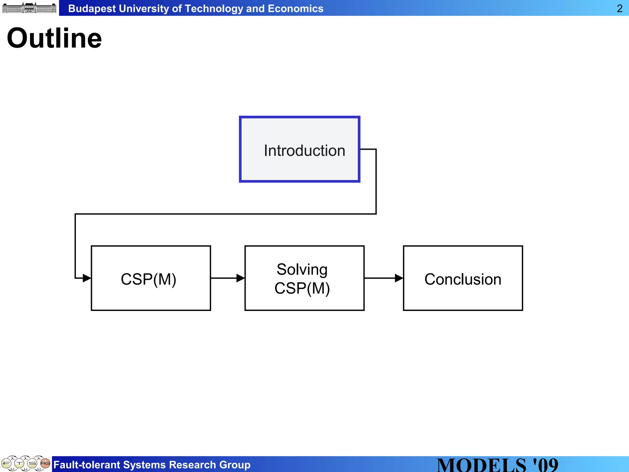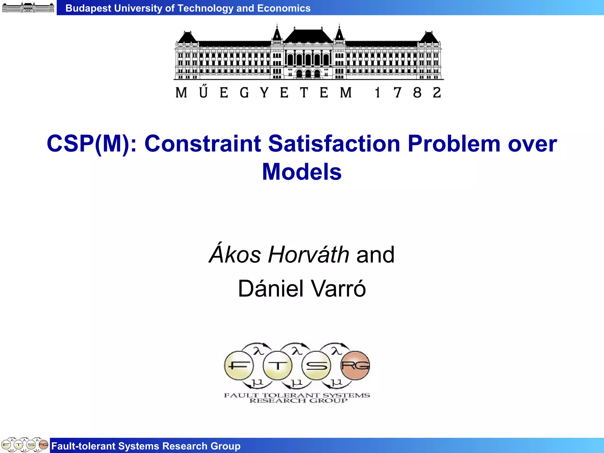 This document discusses constraint satisfaction problems over models (CSP(M)). It defines CSP(M) as being described by an initial model, a set of global constraints, goals, and labeling rules. It presents an example of allocating jobs to partitions in an integrated modular avionics system. Constraints and goals are defined as graph patterns. Labeling rules are defined using graph transformation rules. Solving CSP(M) involves applying labeling rules to reach a state satisfying all constraints and goals, backtracking if needed. The document outlines an implementation over VIATRA2 and discusses optimizations and future work.