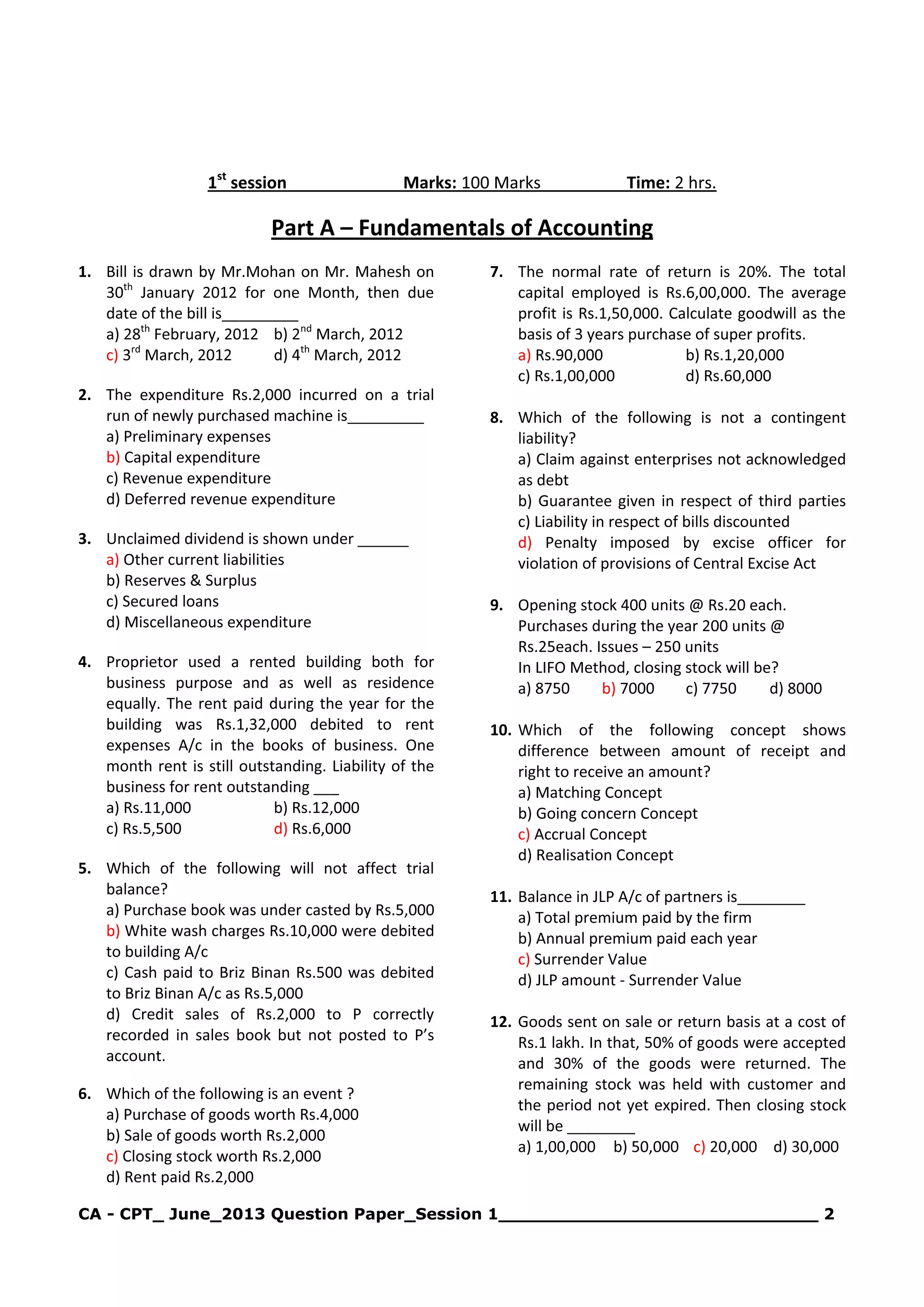 This document appears to be a question paper for a CPT (Common Proficiency Test) exam from June 2013. It contains 47 multiple choice questions testing fundamental accounting concepts. The questions cover topics such as bills of exchange, preliminary expenses, unclaimed dividends, rental expenses, trial balances, accounting equation, partnership admissions/retirements, consignment, accounting policies, joint ventures, valuation of assets, depreciation, financial statements, and more. The summary provides a high-level overview of the document's content as a CPT exam question paper containing multiple choice accounting questions.