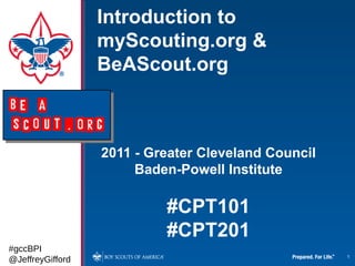 The document provides an overview of the myscouting.org and beascout.org platforms, detailing various resources for scouting leaders, including training courses, internet advancement tools, and unit management features. It emphasizes the importance of maintaining accurate profiles, completing necessary training, and utilizing tools for event registration and tour permits. Additionally, it highlights the role of ScoutParents in supporting scouting activities and the available resources for enhancing the scouting experience.