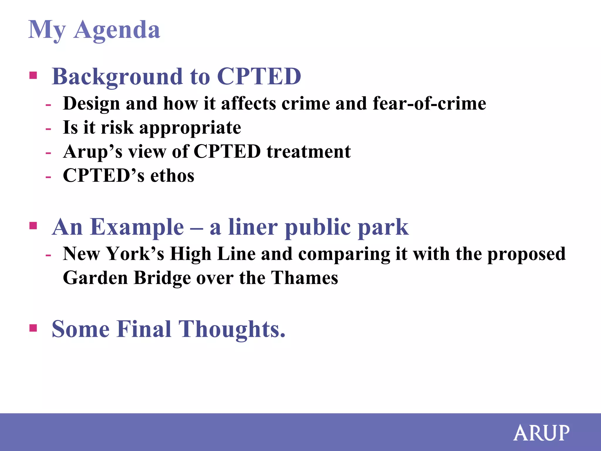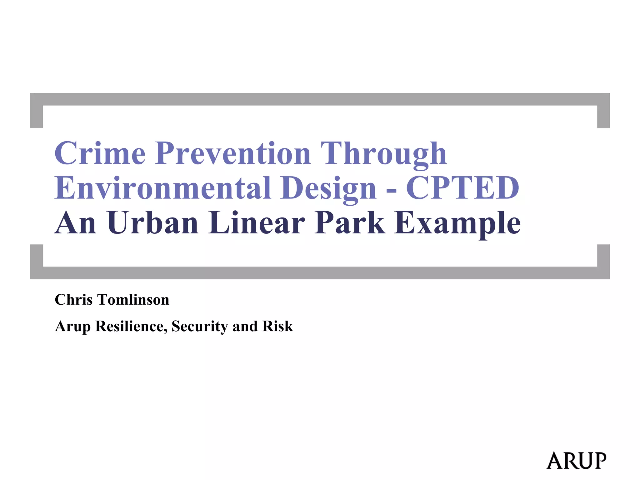 The document discusses Crime Prevention Through Environmental Design (CPTED) principles and provides an example of their application to New York City's High Line park. It summarizes the key CPTED principles of territoriality, natural surveillance, access control, target hardening, image maintenance, and activity support. It then analyzes how these principles were incorporated into the High Line's design, helping to prevent crime and reduce fear of crime. Some of the CPTED strategies used included clear boundaries, lines of sight, controlled access points, durable materials, and programming to encourage activity. The High Line has been very successful with no major crimes reported since it opened.
