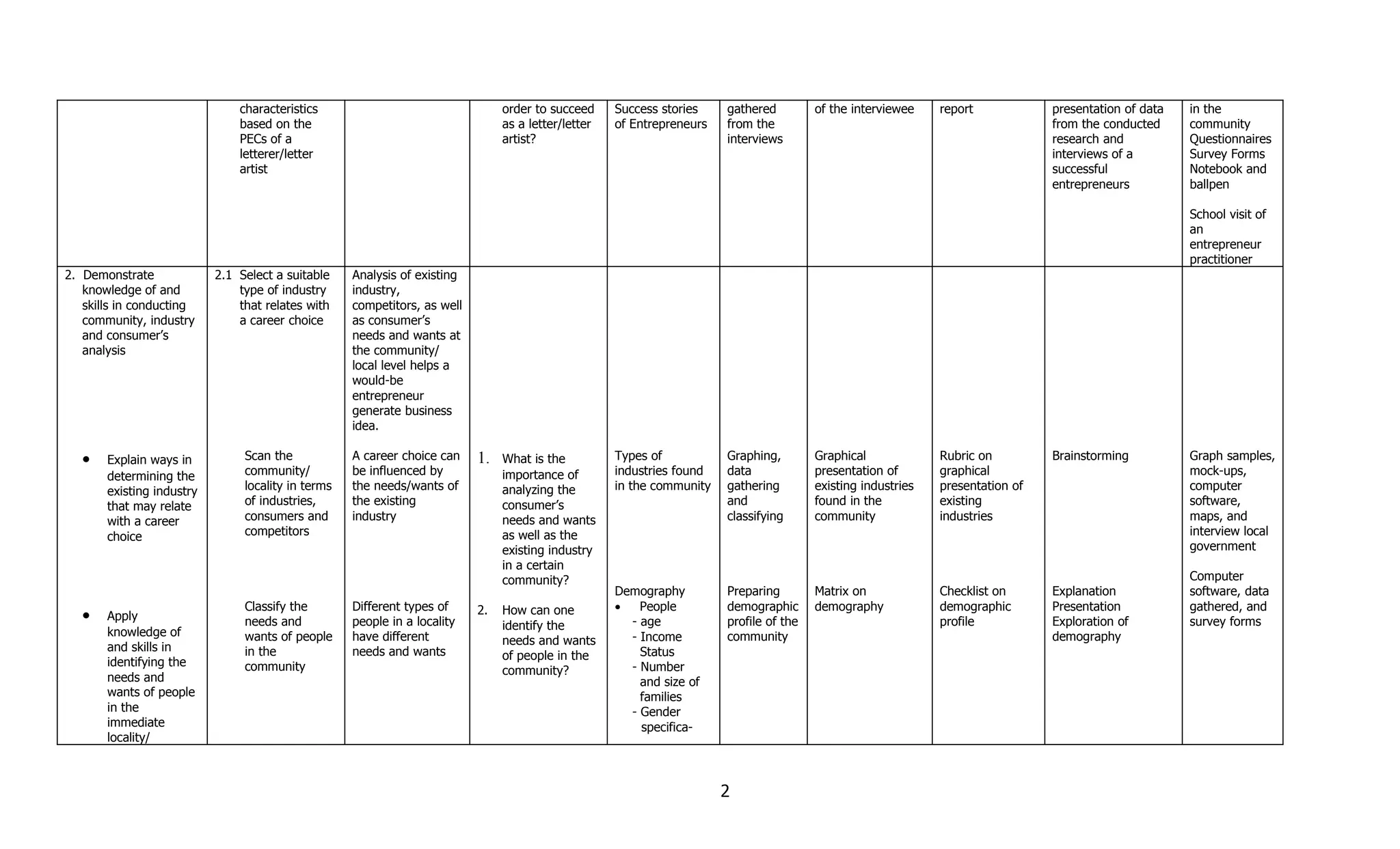 The first grading period focuses on demonstrating knowledge of personal entrepreneurial competencies and lettering skills. Students will 1) assess their personal characteristics and align them with the traits of successful letterers, 2) strengthen areas needing improvement based on self-assessment, and 3) align their characteristics with those of letterers. They will also analyze the lettering industry, competitors, and consumer needs to help choose a career. The goals are to understand the value of entrepreneurial skills and identify characteristics for success in lettering.