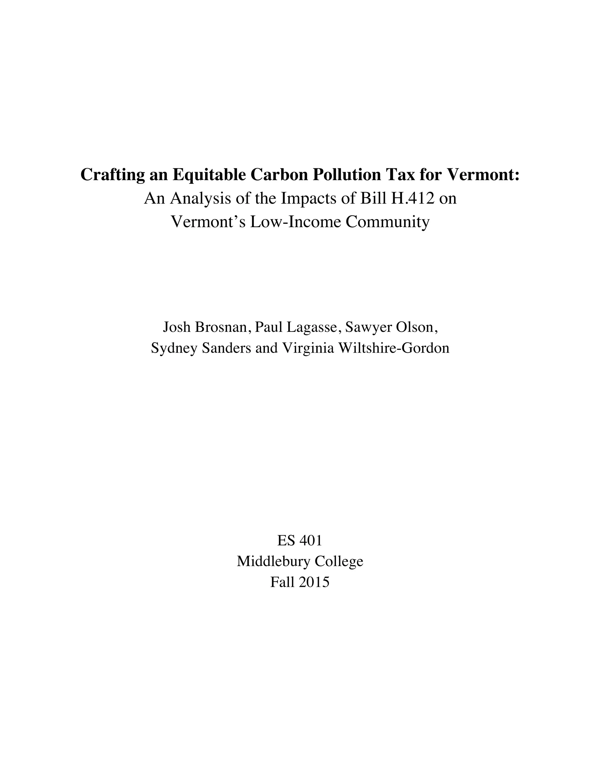 This document provides a summary of research conducted on the impacts of Vermont's proposed Bill H.412, which would establish a carbon pollution tax. The research included case studies of other carbon taxes, expert interviews, a statewide survey, and focus groups with low-income Vermonters. The key findings were that the tax could negatively impact low-income residents unless rebates are provided. The researchers recommend a two-pronged rebate distribution system that provides rebates through tax credits and electronic benefit cards to ensure assistance reaches all low-income households in an equitable manner.