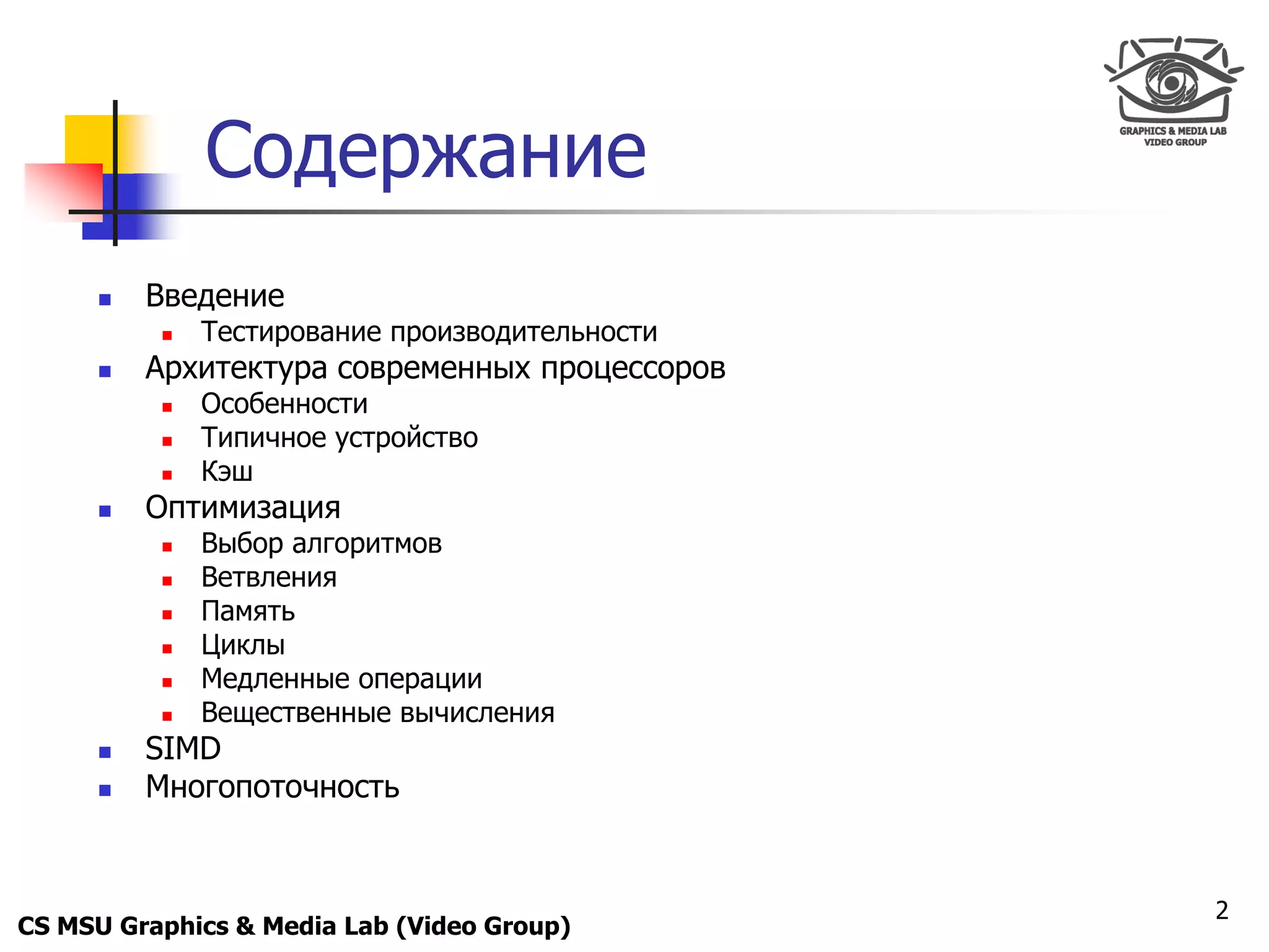 Документ посвящен методам оптимизации программ и алгоритмов, включая тестирование производительности, архитектуру процессоров, оптимизацию кода и выбор алгоритмов. Рассматриваются ключевые аспекты, такие как работа кэша, многоядерные архитектуры, векторные инструкции и использование многопоточности для повышения производительности. Также подчеркивается важность тестирования программ на различных платформах и неспецифичных параметрах для оптимизации.