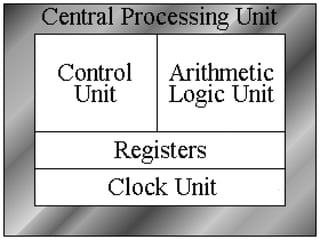 The document discusses the central processing unit (CPU) and its components, functions, and operation. It describes how the CPU reads and executes program instructions, performs calculations, and controls devices. It discusses the CPU's main components like registers, arithmetic logic unit (ALU), control unit, and their functions. It explains how the CPU fetches, decodes, executes instructions, and returns results in a four phase process using clock pulses and memory units like RAM, ROM, and cache.