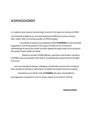 The document provides details about the author's summer training project at the Central Public Works Department (CPWD) construction site at the National Institute of Technology in Durgapur, India. It acknowledges and thanks various CPWD officials and others who supported the project. The preface explains that the report gives a detailed description of site visits, interactions with engineers, and lessons learned about construction principles and machinery. It provides background about CPWD, an overview of the hostel construction project, and covers topics like site location, safety procedures, formwork, sequencing of structural work, project monitoring, quality control, and conclusions.
