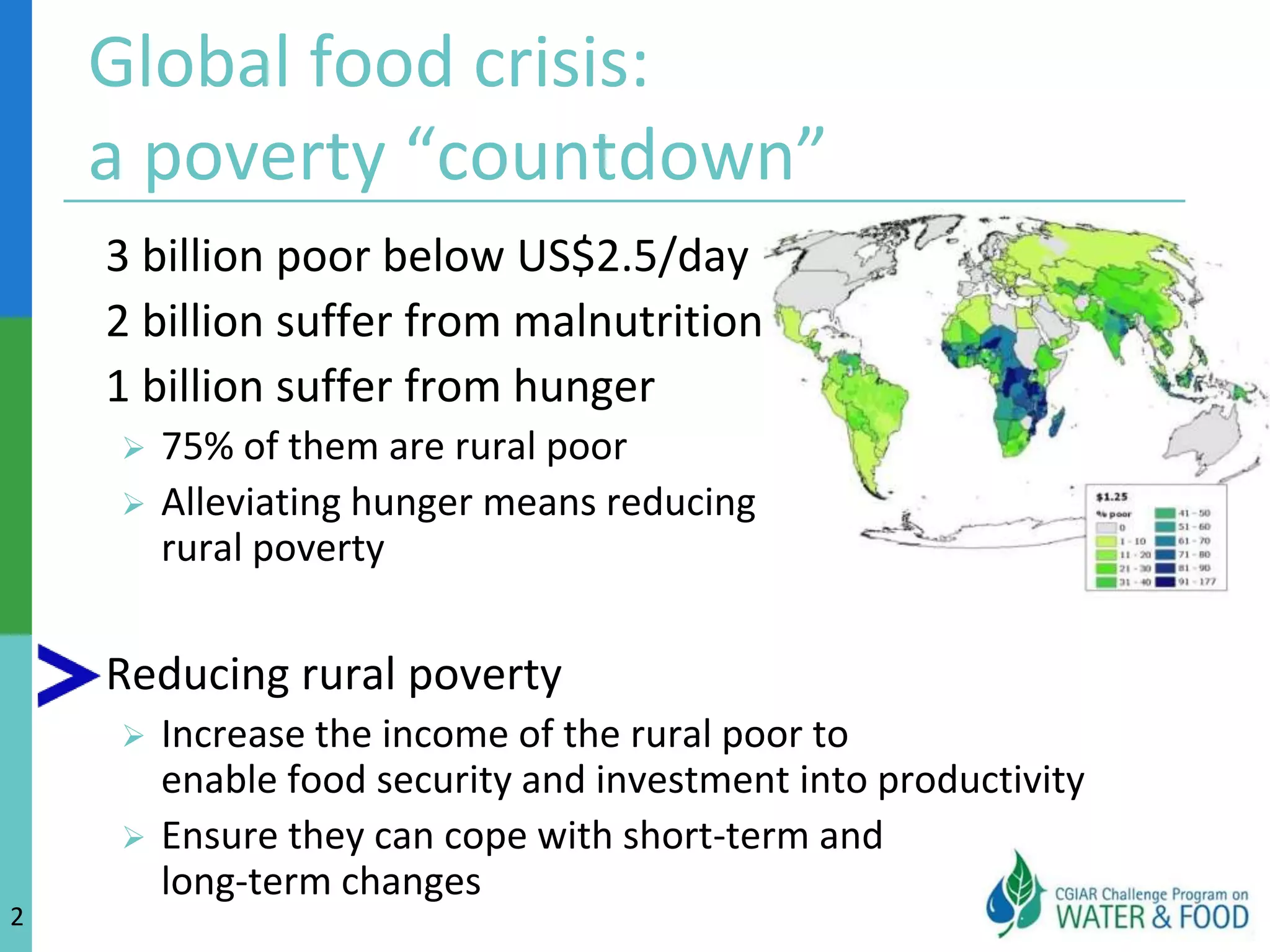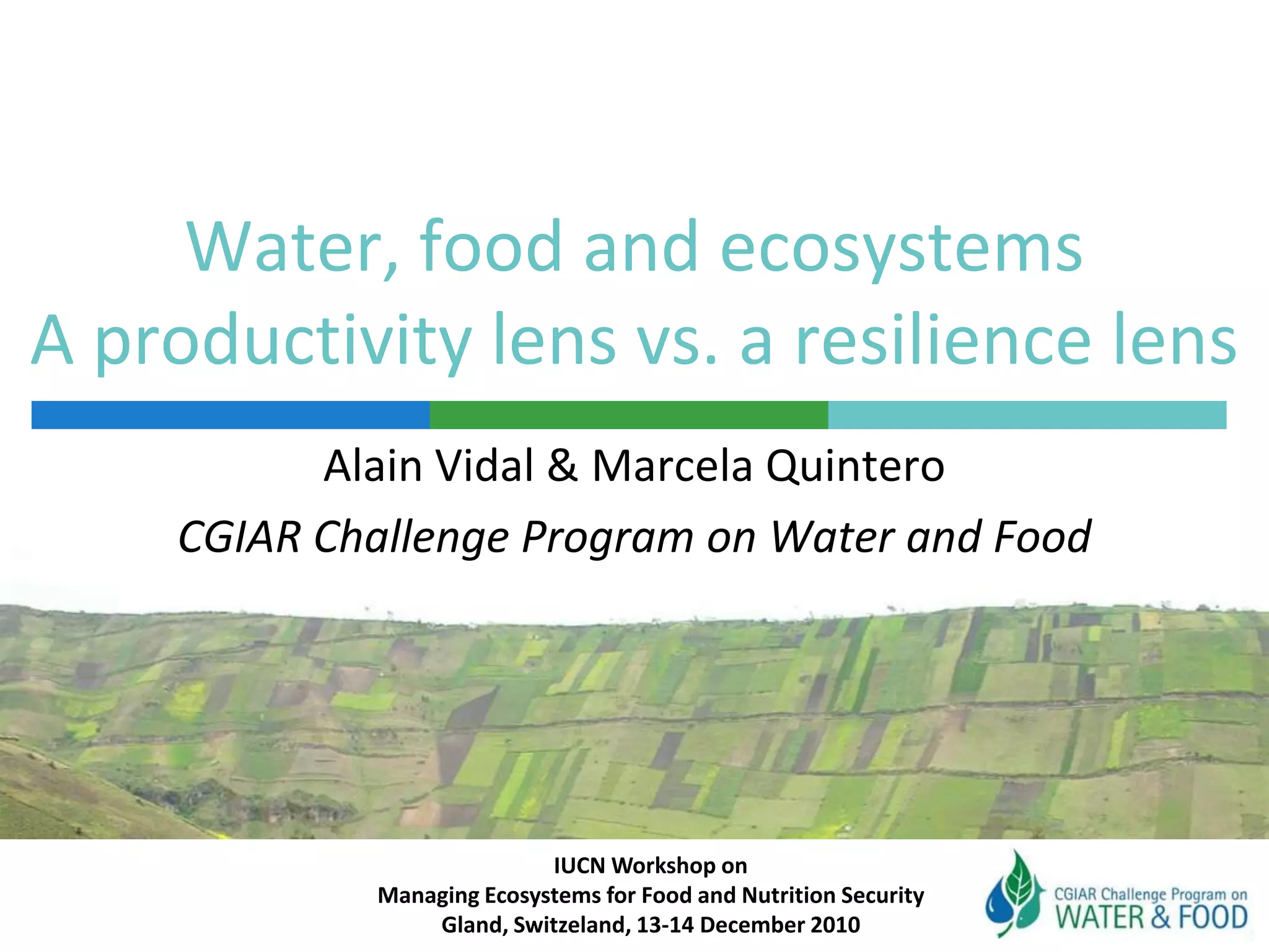 The document highlights the interrelationship between water management, productivity, and resilience in food production systems, particularly among rural poor populations facing food insecurity. It discusses the role of improved water productivity and ecosystem restoration in enhancing social-ecological resilience while addressing poverty and malnutrition. The document emphasizes the importance of a balanced approach that considers both productivity and resilience to effectively support food security and alleviate rural poverty.