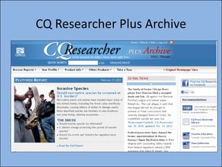 This document provides instructions for using the CQ Researcher Plus Archive database. It explains that the search bar can be used to search for specific topics or the browse option can be used to view available topics. It also notes that the date of reports should be considered. Each report contains an overview of the topic, various information sections, and a Pro/Con section presenting different expert opinions on a question. Reports can also be emailed or printed in full or in part. The CiteNow feature shows how to cite reports using different citation styles.