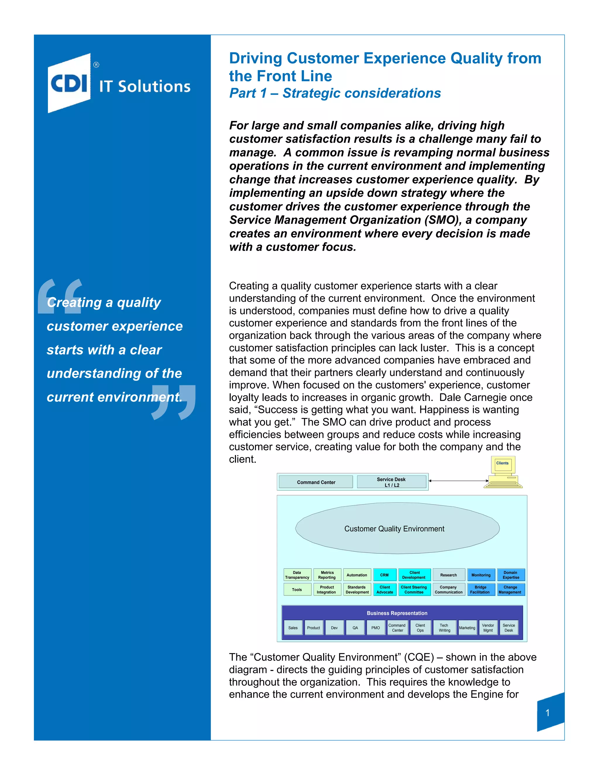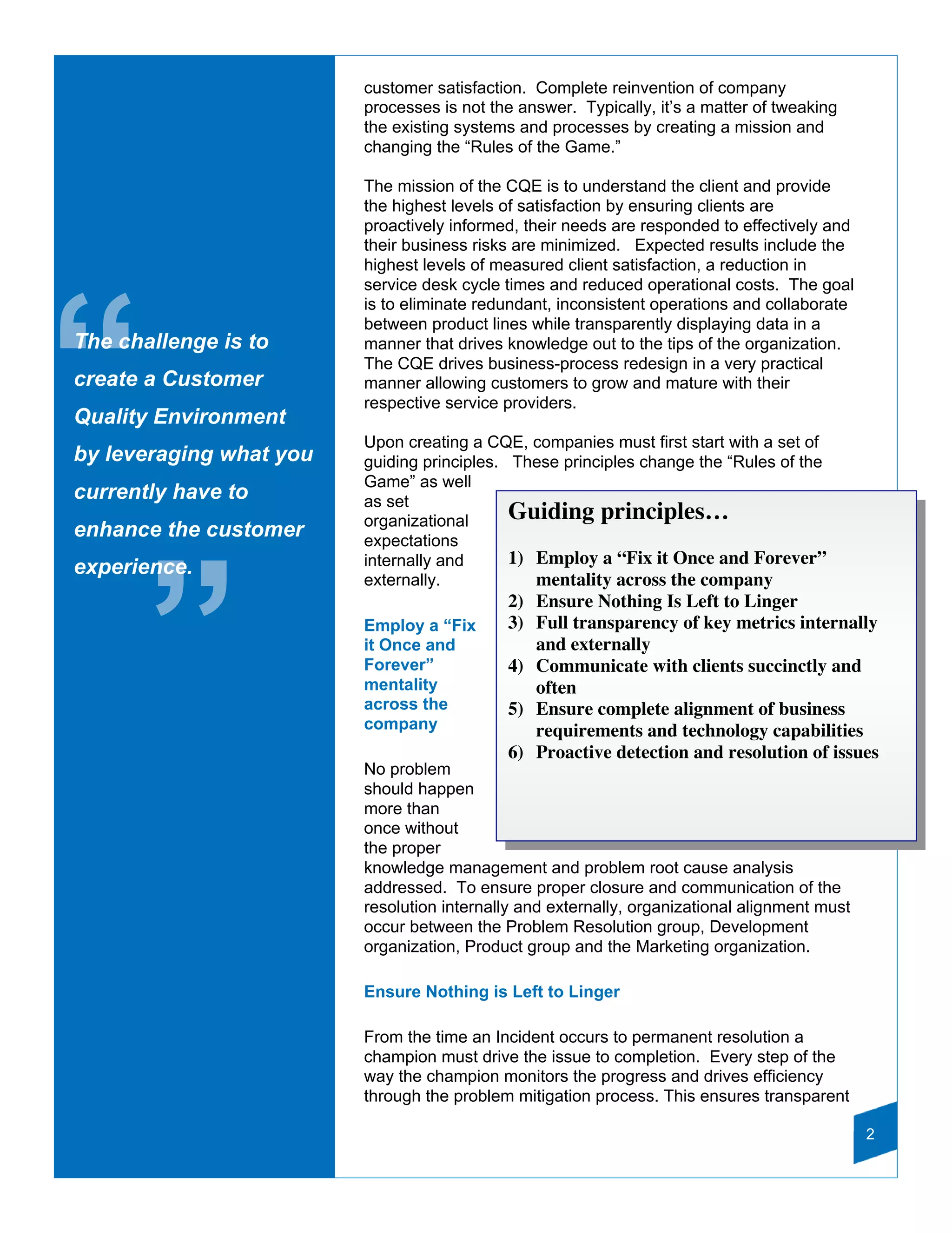 The document discusses establishing a Customer Quality Environment (CQE) by leveraging existing systems and processes to enhance the customer experience, with the goal of understanding customers and providing the highest levels of satisfaction. It recommends implementing guiding principles like employing a "Fix it Once and Forever" mentality, ensuring full transparency of key metrics, and communicating with clients succinctly and often to drive organizational alignment around customer satisfaction. The challenge is to create a CQE that enhances the customer experience through tweaking existing processes and changing organizational expectations.