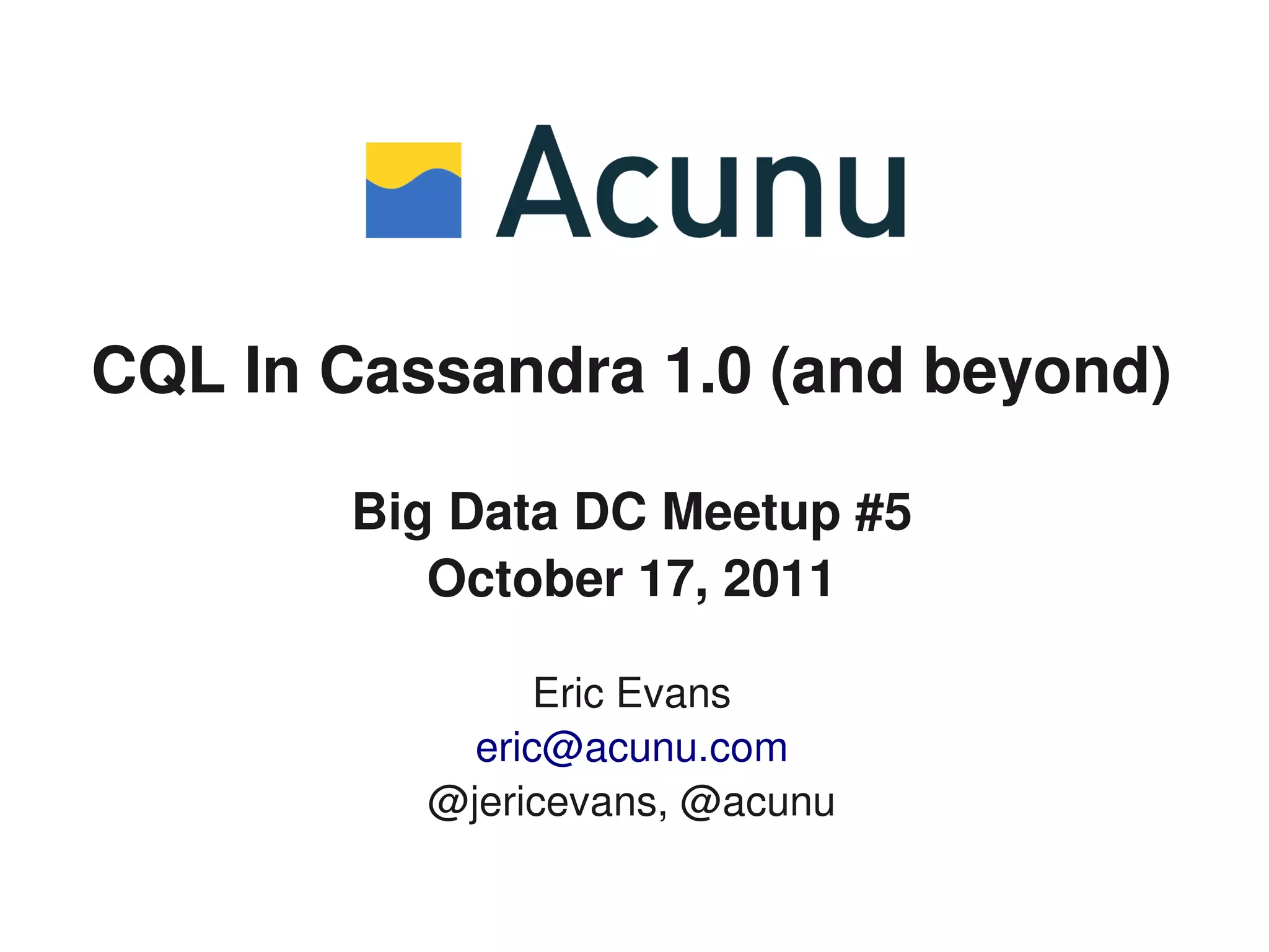 This document provides an overview and history of the Cassandra Query Language (CQL) and discusses changes between versions 1.0 and 2.0. It notes that CQL was introduced in Cassandra 0.8.0 to provide a more stable and user-friendly interface than the native Cassandra API. Major changes in CQL 2.0 included data type changes and additional functionality like named keys, counters, and timestamps. The document outlines the roadmap for future CQL features and lists several third-party driver projects supporting CQL connectivity.