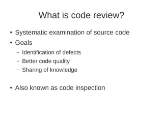 This document discusses code review practices. It defines code review as the systematic examination of source code to identify defects, improve code quality, and share knowledge. Code review should occur after implementation but before testing. Reviews are done by peers to benefit from different perspectives and to spread knowledge across the team. Tips for effective code reviews include choosing the right person, reviewing the right amount of code, building checklists, providing positive feedback, and accepting reviews constructively. Code reviews can find more bugs than testing alone and improve code quality and maintainability.