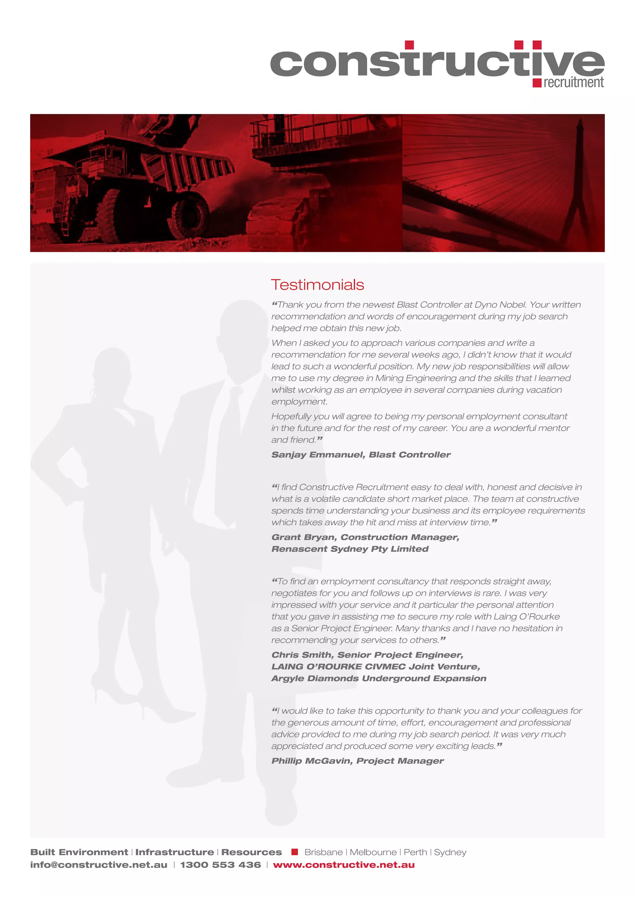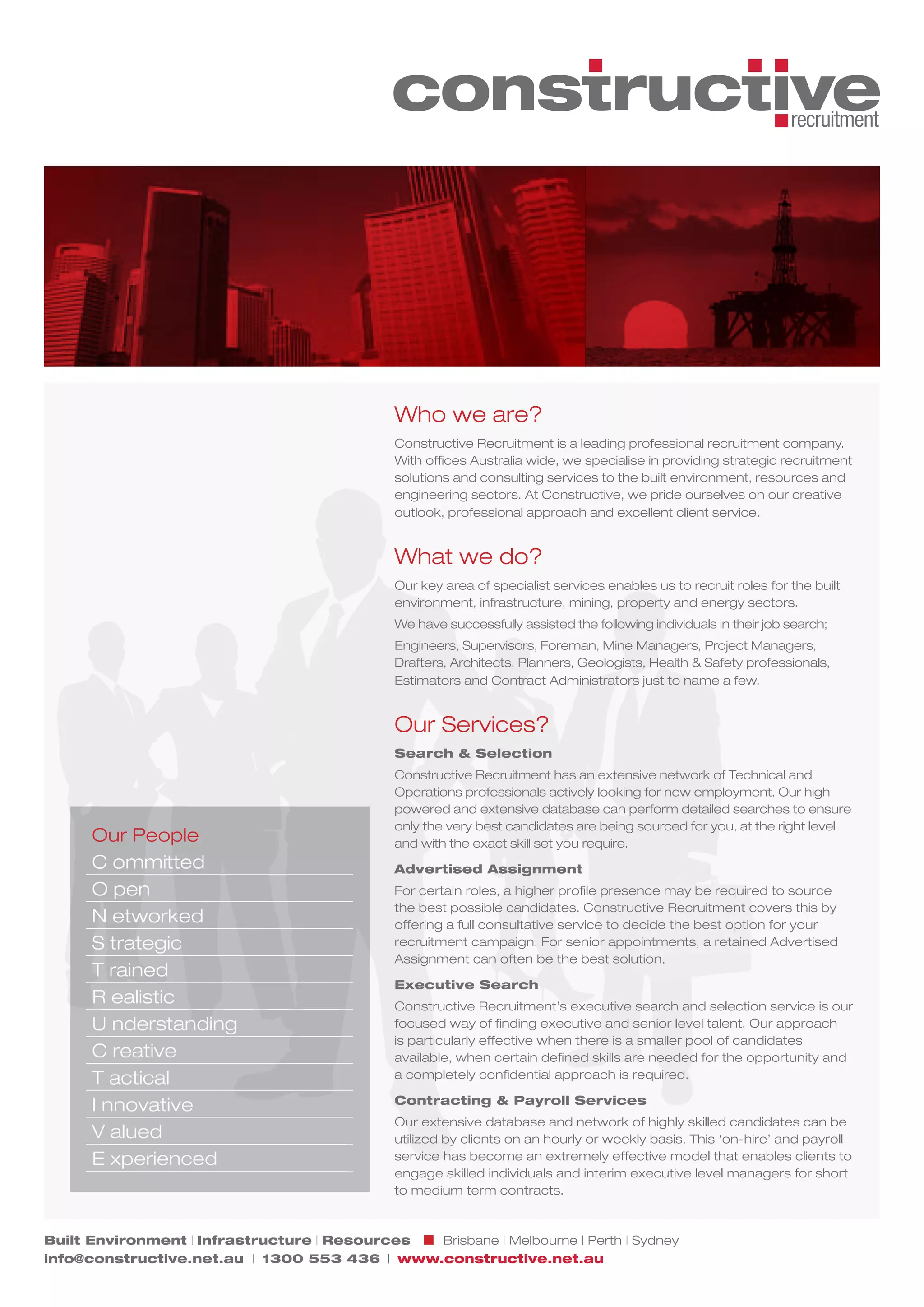 Constructive Recruitment is a leading professional recruitment company with offices across Australia specializing in providing recruitment solutions and consulting services to the built environment, resources, and engineering sectors. They recruit for roles in built environment, infrastructure, mining, property, and energy sectors. Their services include search and selection, advertised assignments, executive search, contracting and payroll services. They assist individuals in their job search for roles like engineers, project managers, and health and safety professionals.