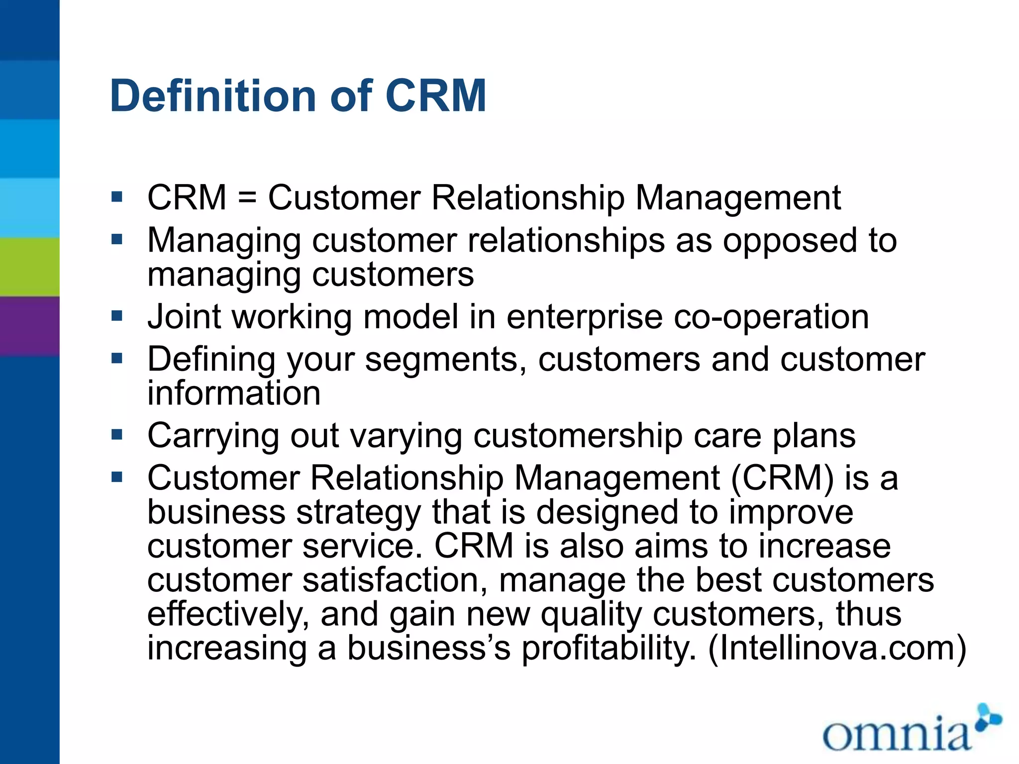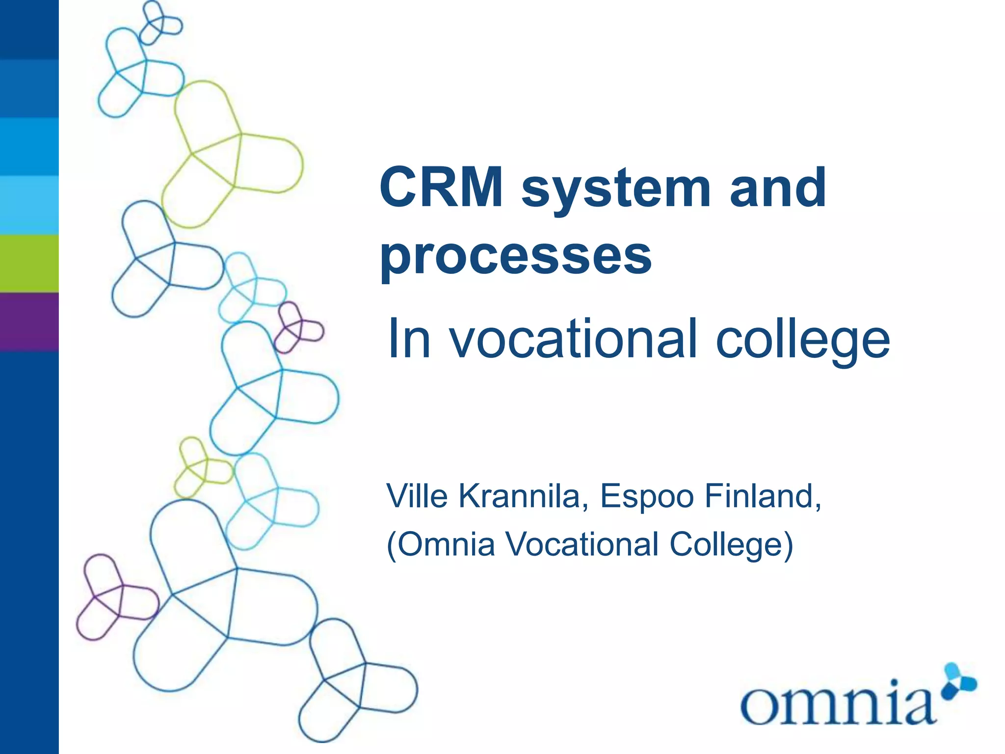 This document discusses CRM (Customer Relationship Management) systems and processes used at Omnia Vocational College in Finland. It provides definitions of CRM and describes a 4-year project at Omnia from 2006-2010 that developed and implemented a CRM strategy and database. The project resulted in a customer strategy, customer leadership models, customer segmentation, and customer care programs. It also created a manual for the CRM database. The document outlines the basics, advantages, and a pilot project process for implementing a CRM database. It provides details on Omnia's current CRM database users, integrations with other systems, and responsibilities for CRM data and processes across administrative, marketing, and customer-facing units