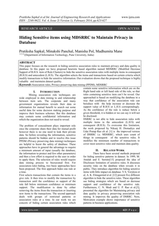 The paper presents the MDSRRC (Modified Decrease Support of R.H.S. item of Rule Clusters) algorithm, which aims to hide sensitive association rules in databases while preserving data quality. The approach focuses on modifying a minimum number of transactions to achieve this, ensuring that sensitive information is concealed without generating new non-sensitive rules. Experimental results demonstrate that MDSRRC outperforms previous methods like DS-RRC by effectively maintaining the integrity of the dataset while achieving privacy goals.