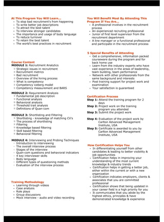 The Certified Recruitment Analyst (CRA) program is a two-day training aimed at enhancing recruitment practices, with a focus on preventing bad hiring and retaining top talent. Participants will learn key skills such as behavior-based interviewing, requirement analysis, and effective candidate filtering, alongside networking opportunities and post-training support. Certification from the program boosts professional visibility, improves recruitment knowledge, and indicates a commitment to high ethical standards in the field.