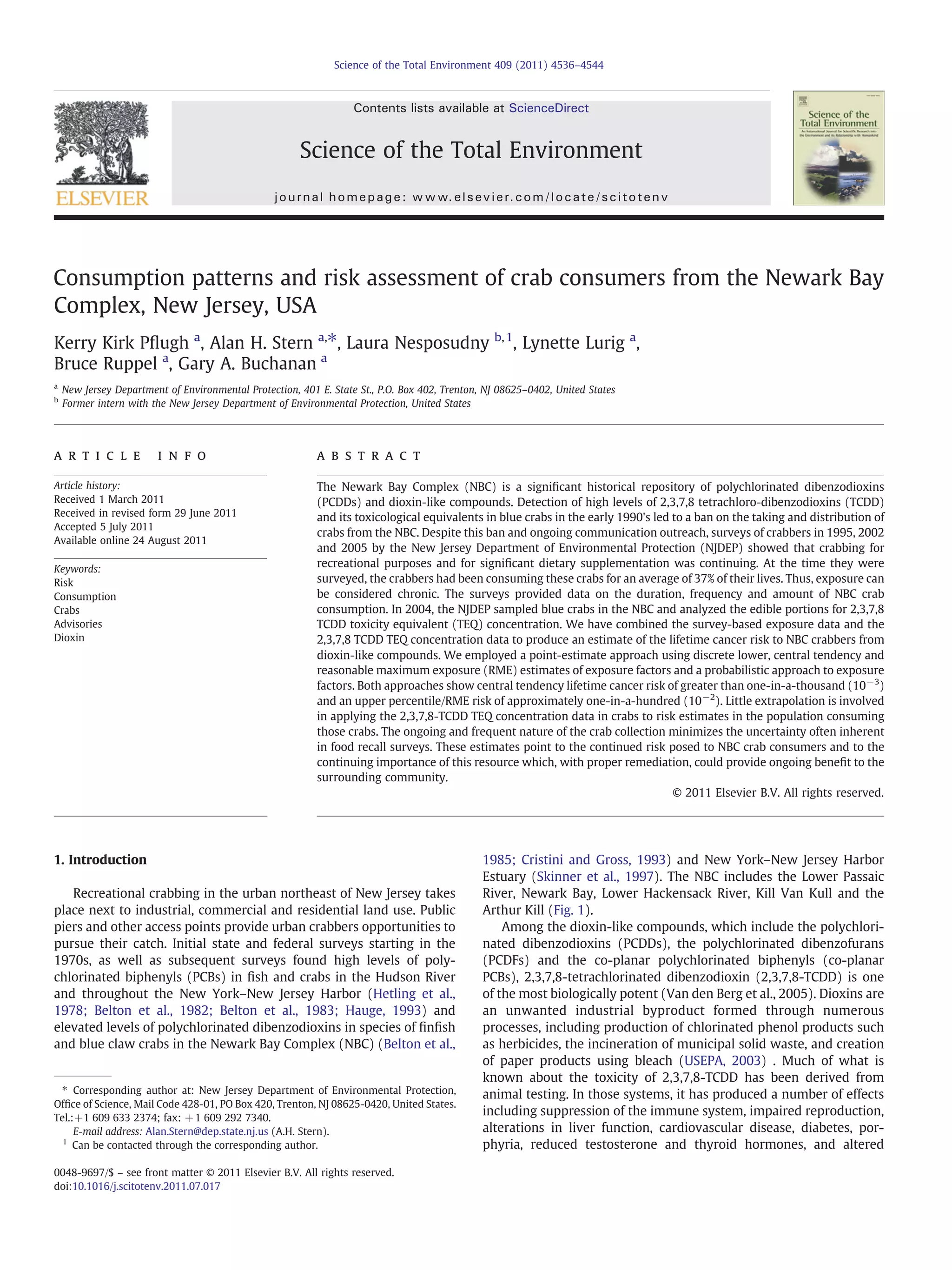 This document summarizes a study that assessed the risk of cancer from consumption of blue crabs caught in the Newark Bay Complex in New Jersey. High levels of dioxins were found in crabs in the early 1990s, leading to a ban on catching and selling crabs from the area. However, surveys from 1995 to 2005 found that people were still regularly catching crabs recreationally and consuming them, exposing themselves chronically to dioxin compounds. By combining data on crab consumption patterns with dioxin levels measured in crabs, the study estimated a lifetime cancer risk above 1 in 1000 for regular consumers and above 1 in 100 for those with higher estimated exposure. The ongoing consumption of crabs from this contaminated site continues to