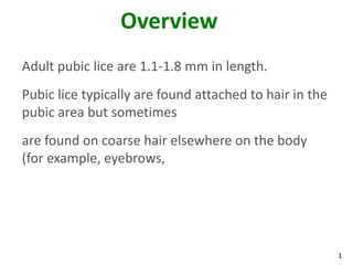 Pubic lice, also known as crab lice, are small parasites typically found in the pubic area and may spread through sexual contact. Treatment options include over-the-counter medications containing permethrin or pyrethrins, as well as prescription options like lindane and malathion, although the latter is not FDA-approved for pubic lice. Proper treatment involves following instructions carefully and ensuring all sexual partners are informed and treated to prevent reinfestation.