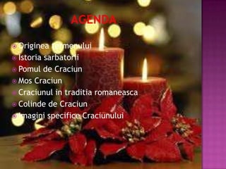 Documentul detaliază originile și istoria sărbătorii Crăciunului, evidențiind începuturile acesteia în secolul al IV-lea și influențele culturale, precum tradiția bradului de Crăciun adusă de popoarele germanice. Moș Crăciun, derivat din Sfântul Nicolae, este accentuat ca un simbol modern care aduce bucurie copiilor. În România, Crăciunul este considerată una dintre cele mai importante sărbători creștine, fiind anunțată prin colinde și obiceiuri specifice.