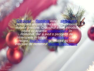 Crăciunul în România este o sărbătoare majoră, celebrată pe 25 decembrie, cu rădăcini în tradiții precreștine și influențe comuniste. Este asociat cu obiceiul de a dărui și cu simboluri ca bradul de Crăciun, care reprezintă speranța și prosperitatea. Tradițiile românești includ împodobirea bradului și daruri aduse de Moș Crăciun, consolidând astfel legătura comunității cu valorile culturale și religioase.