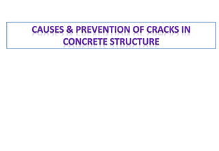 Cracks in concrete structures can be classified as thin (less than 1mm), medium (1-2mm), or wide (more than 2mm). Cracks are caused by factors like plastic shrinkage during curing, drying shrinkage due to moisture loss, thermal stresses from temperature changes, chemical reactions between aggregates and alkalis, and weathering from freezing and thawing. Cracks are evaluated based on their location, extent, and width. Repair methods include epoxy injection into cracks, routing and sealing cracks, reinforcing around cracks, and cement grouting of cracks. Left unrepaired, cracks can compromise the structural integrity and durability of concrete.