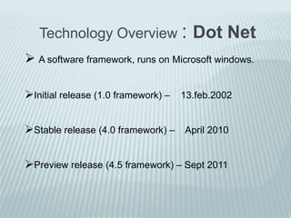 The document discusses the .NET framework and its components like the Common Language Runtime. It also discusses C# programming language and how the Crack MCTS project helps aspirants prepare for Microsoft certifications like MCTS through features like exam selection guidance, study material recommendations, an online exam simulator, and a forum to ask questions. The project includes database tables to store user registrations, questions, and queries.
