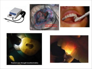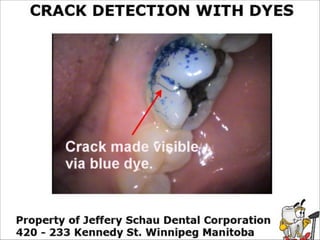 This document discusses cracked tooth syndrome, including its classification, incidence, etiology, symptoms, diagnosis, and treatment. It begins with a brief history of cracked tooth classification from the 1950s onwards. Cracked tooth syndrome can be classified into different types including craze lines, cracked teeth, fractured cusps, split teeth, and vertical root fractures. Cracked teeth most commonly occur in those aged 30-50 years old and involve the mandibular molars. Symptoms include pain from cold or pressure. Diagnosis involves dental history, visual examination, tactile examination, bite tests, staining, transillumination, and sometimes radiographs. Treatment aims to stabilize the crack immediately with splints or crowns and may involve