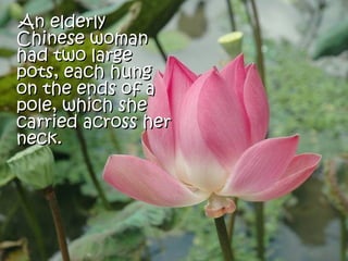 An elderly Chinese woman carried two pots on a pole across her neck daily to fetch water from a stream. One pot had a crack and could only deliver half its water, while the other pot was perfect. For two years, the cracked pot was ashamed of its imperfection. However, the woman had planted flower seeds along the side of the path with the cracked pot's water, allowing it to decorate the table with flowers. She told the pot that without its flaw, there would be no beauty in the house. Each person has their own unique flaws that make life interesting.