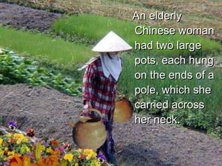 An elderly Chinese woman carried two pots on a pole across her neck to transport water - one pot was perfect while the other had a crack, causing it to only deliver half as much water. For two years this occurred daily. The cracked pot felt ashamed of its imperfection while the perfect pot felt proud. However, the woman had planted flowers along the cracked pot's side of the path, which it watered during the walk, allowing her to decorate her home with beautiful flowers. She explained to the cracked pot that it was its flaw that enabled this beauty, and that everyone has their own unique flaws that make life rewarding.