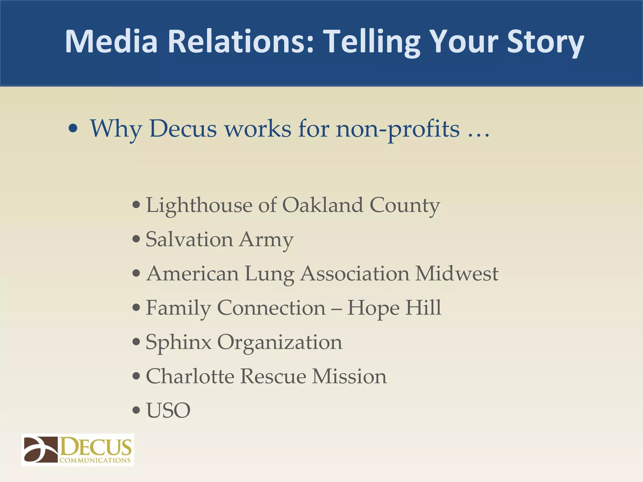 The document provides an overview of media relations and social media strategies for non-profits. It discusses defining your organization's message and value proposition, using public relations to generate earned media coverage through outlets like news articles and letters to the editor, and leveraging various social media tools like blogs, Facebook, Twitter, and YouTube to engage stakeholders and share your story. Specific examples are given of how non-profits have successfully utilized these strategies.